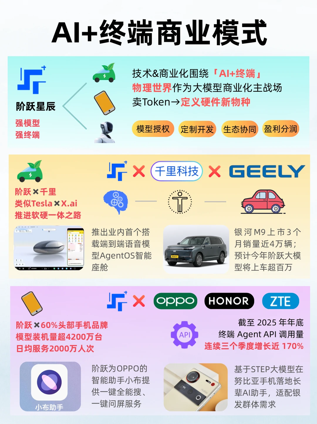 阶跃走的是基模&AI+终端的发展路线,对标到海外类似Tesla+X.AI,这种“软硬一体”的模式,相比纯模型路线竞争壁垒更高。现在大模型公司卖Token的市场已经一片红海了,阶跃“强模型+强终端”的商业逻辑很有战略眼光,既能做模型授权,也能定制开发,还可以实现生态协同。