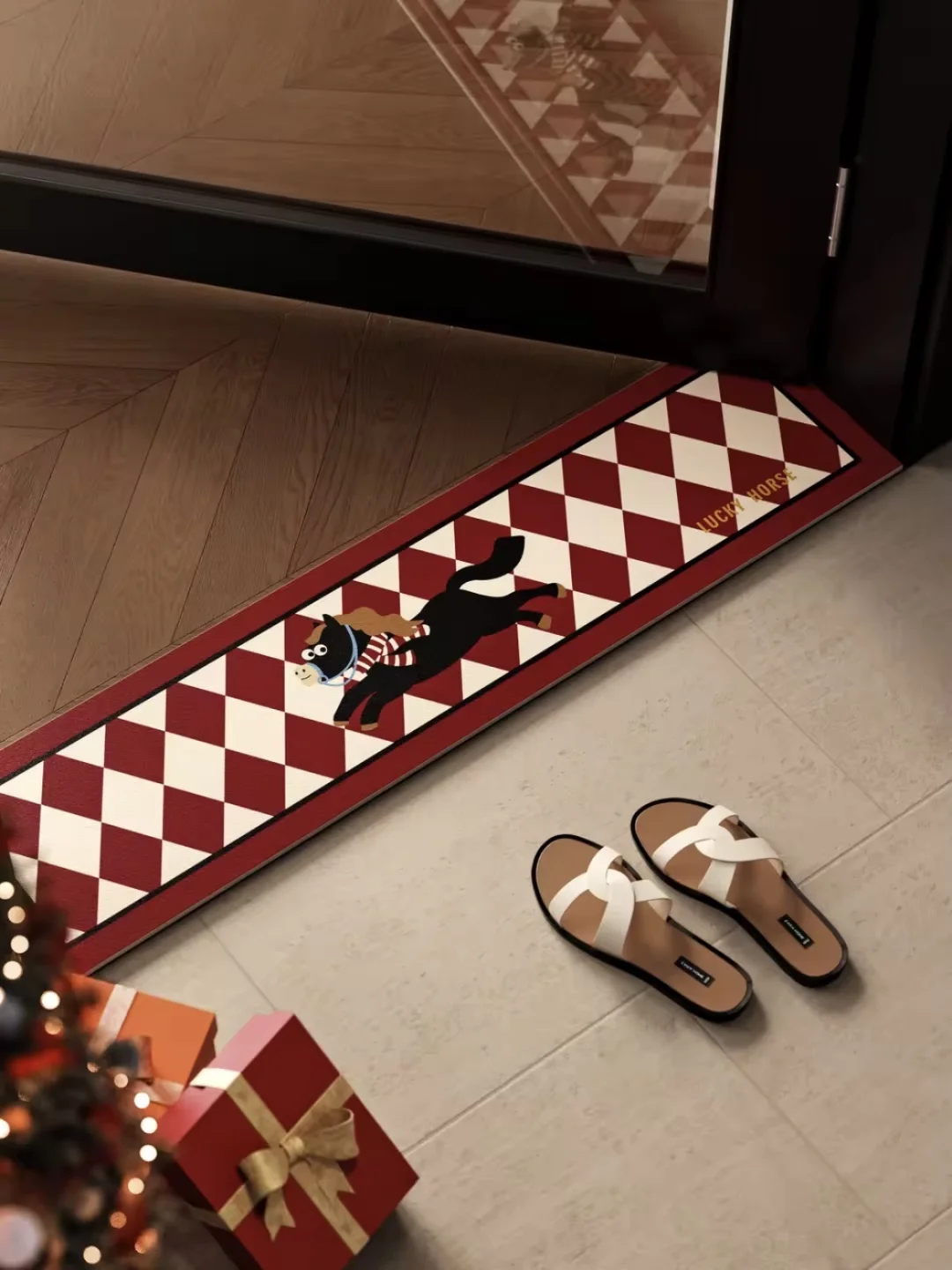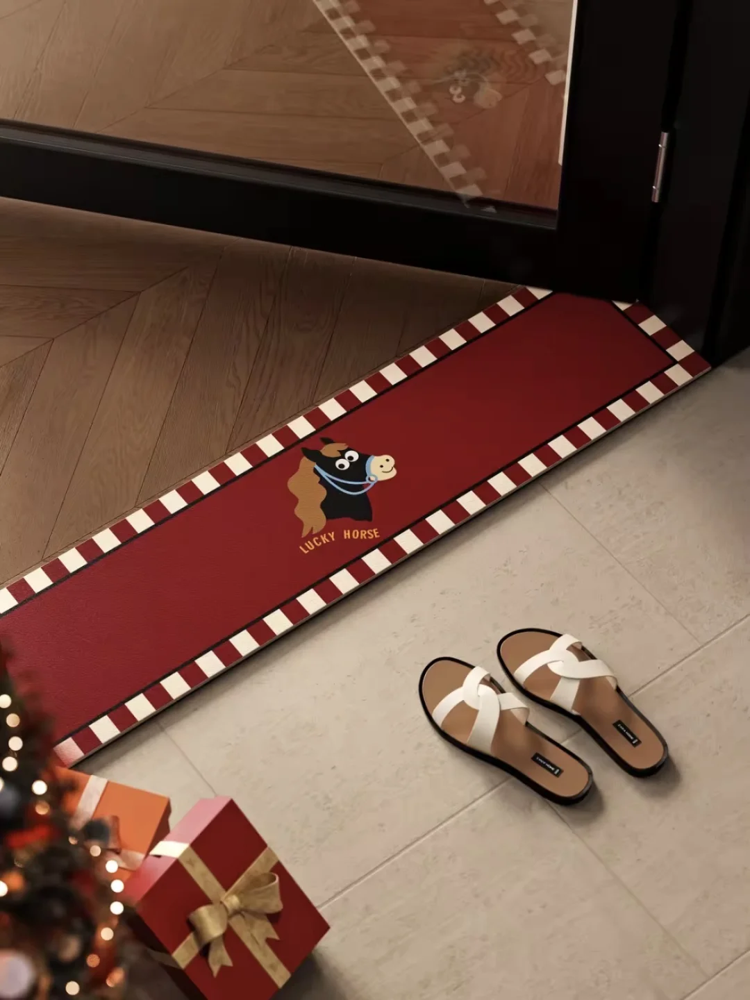手绘小黑马图案 憨萌讨喜 搭配复古红色底 烘托温暖节庆感 无需敲砖或改色! 直接铺在原有门槛石上 轻松遮丑 提升空间精致度 为进门处增添一丝趣味与氛围 适合新年、圣诞等温馨节日布置 日常使用也耐看有质感 -