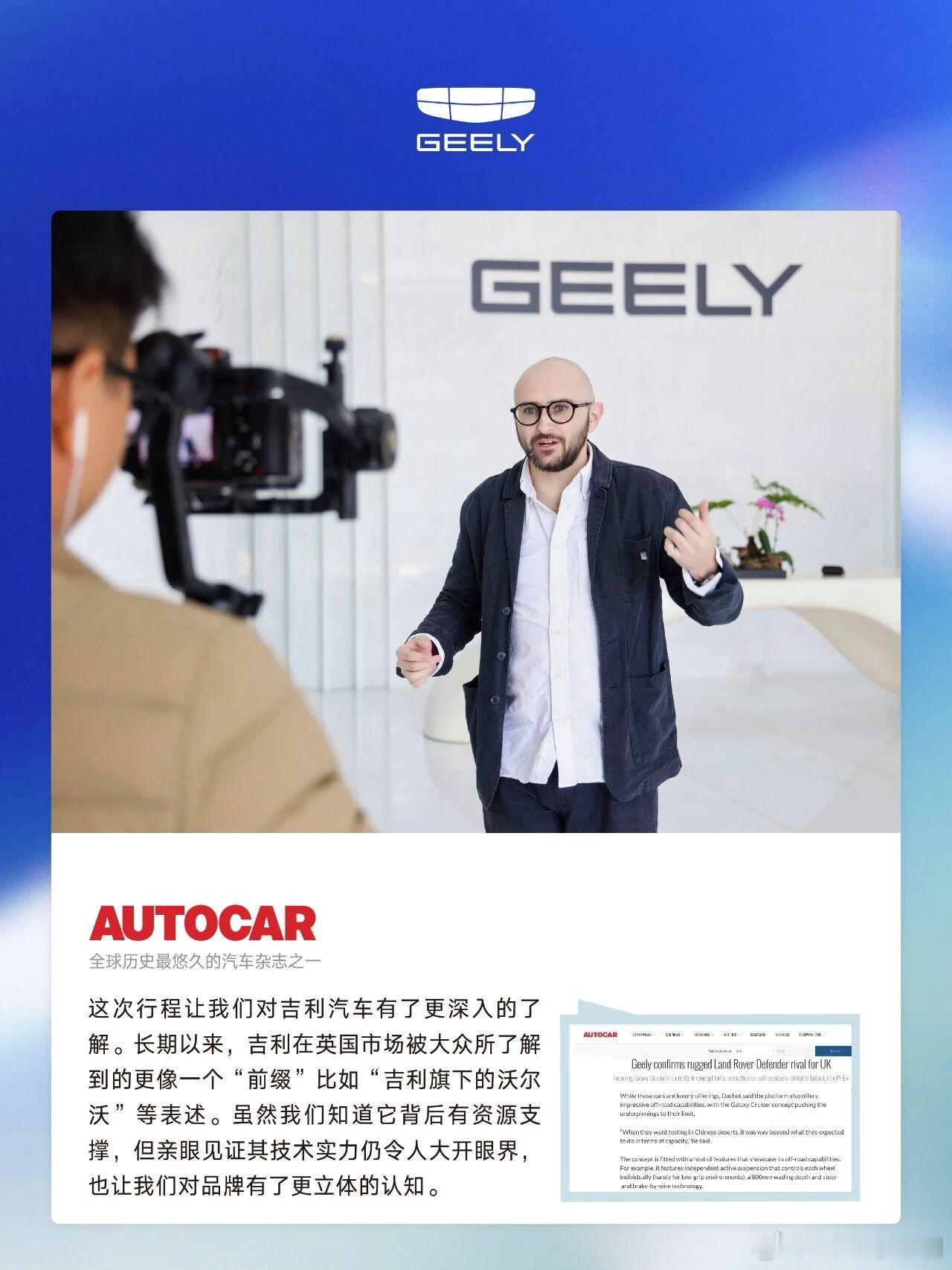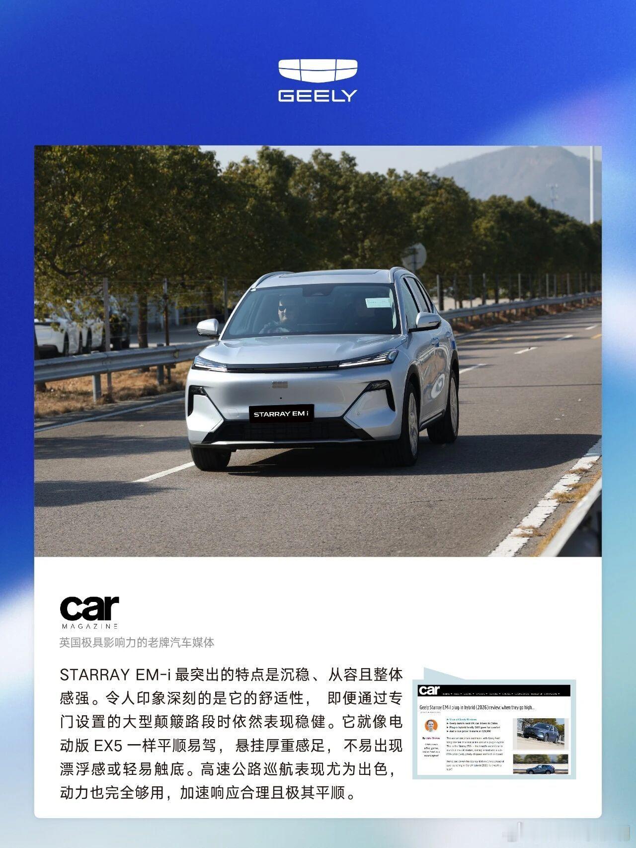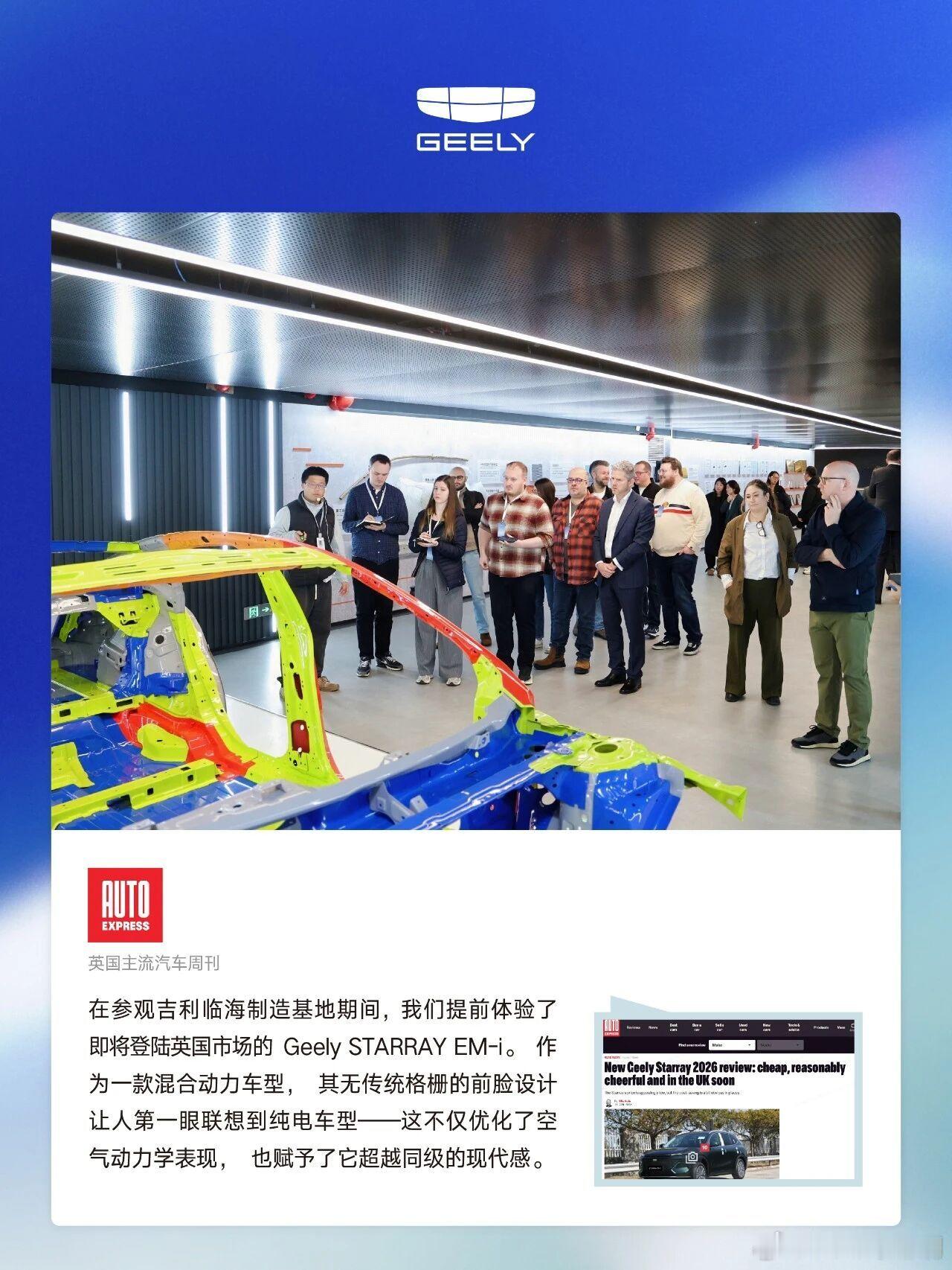 英国媒体盛赞吉利科技与安全实力新年伊始,吉利汽车邀请英国主流汽车媒体代表团展开为期三天的深度探访。来自Forbes、Autocar、Autotrader、Car Magazine等英国顶级汽车媒体的资深记者,先后走进吉利全域安全中心、研究院、临海制造基地及吉利汽车总部,零距离感受吉利在安全研发、智能科技、产品工程与品牌构建上的深厚积淀与前沿布局。活动期间,媒体代表团通过实地参观、技术讲解与深度交流,对吉利在全球研发体系、制造标准以及技术创新能力给予了高度评价。在参观临海制造基地时,代表团还率先动态体验了即将登陆英国市场的Geely STARRAY EM-i(部分区域命名Geely EX5 EM-i),并静态品鉴了未来计划引入英国的多款重磅车型。此次探访不仅让英国汽车权威媒体深入感知到吉利的品牌实力与技术底蕴,也为吉利新一代产品在英国市场的亮相做足了预热铺垫。未来,吉利将持续深化全球交流与合作,以创新技术与卓越产品,迎接更多国际市场的期待与认可。吉利汽车