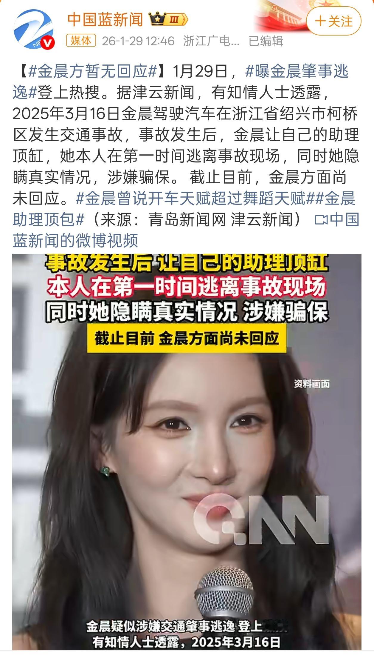 曝金晨肇事逃逸涉嫌肇事逃逸,涉嫌骗保?这是去年3月份的事情,目前爆出来,目前没有获得回应。