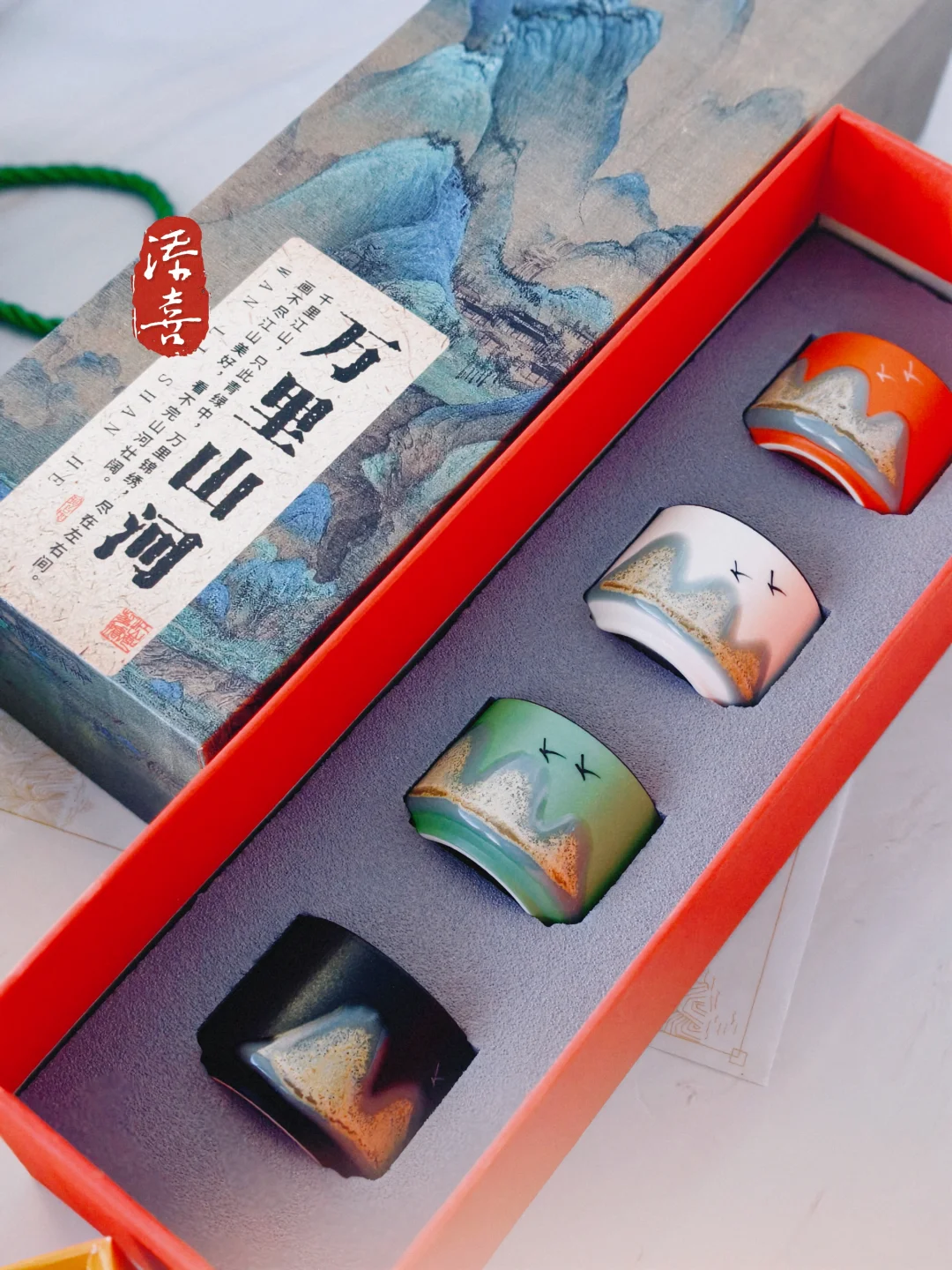 🌟 徳寿宫万里山河茶具:四只渐变釉色茶杯,黑金、翠绿、粉蓝、橙红,每只都像一幅山水画,喝茶都变得有仪式感