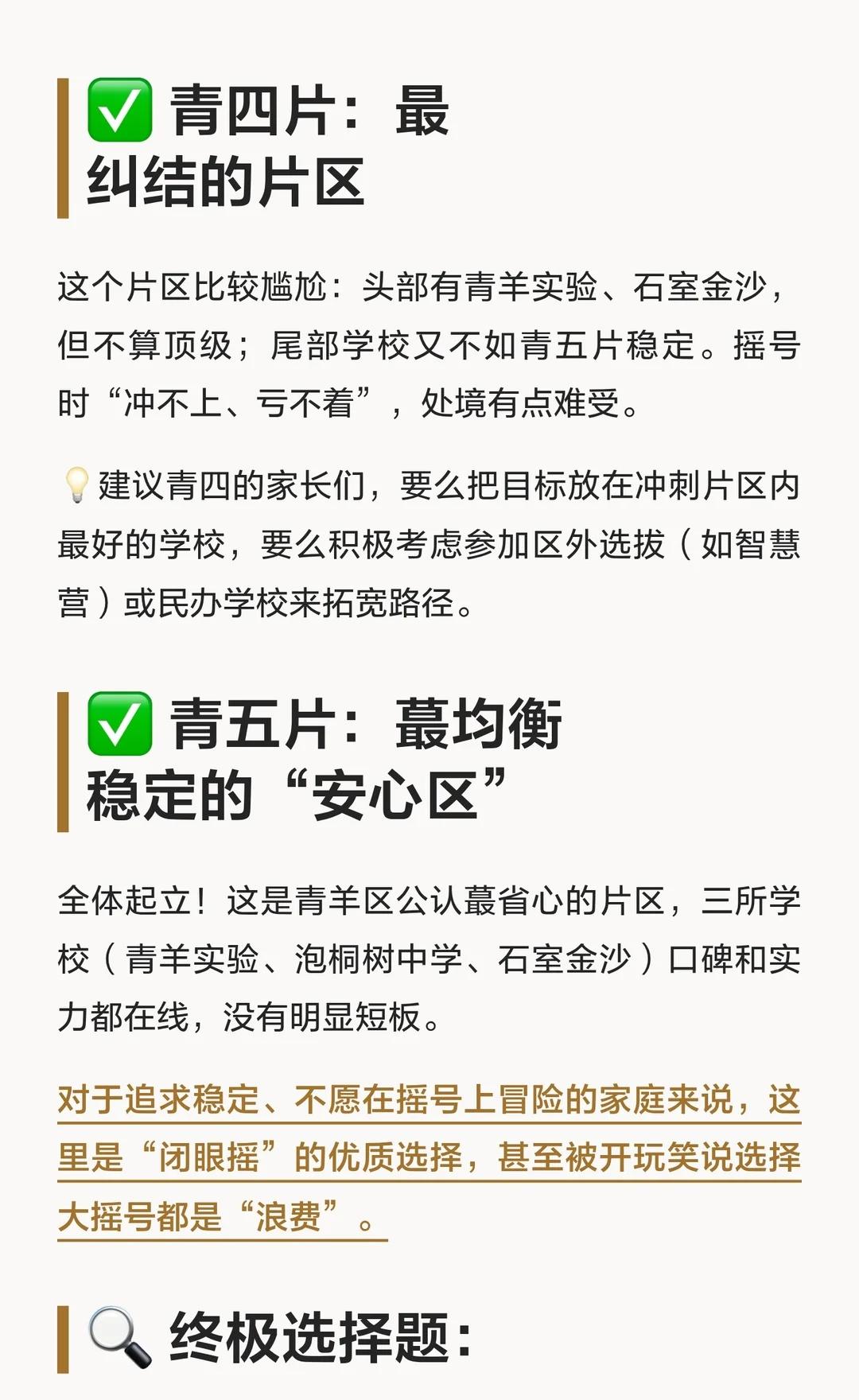一次性说清楚成都青羊片区的含金量!! [飞吻]青羊区的爸妈们,还在为娃儿的小升初片区纠结吗?一句话概括:想冲顶尖选青二,求稳均衡选青五。下面是各片区的核心特点: …… 👉 青一片:配置两极,摇号像“开盲盒”,机遇与风险并存。 👉 青二片:顶级名校(东马棚/陕西街)集中地,但需承担摇中普通校的风险,适合目标清晰、能做两手准备的家庭。 👉 青三片:中规中矩,比上不足比下有余。 👉 青四片:蕞为纠结,头部学校不拔尖,尾部学校欠稳定,需要额外规划出路。 ✅ 青五片:公认的“安心区”,三所学校均好性强,是求稳家庭的理想选择。 …… 📌 核心选择逻辑: 💡选青五:孩子需良好环境托举,家长心态求稳。 💡选青二:孩子是顶尖学苗,家庭愿意为顶级机会承担更高风险。 片区选择本质是教育心态的折射。了解信息,是为了在规则内,结合娃儿的特质,做出更清醒、更从容的决策。 青羊区 升学规划 公办中小学 教育规划 成都 成都青羊区 小升初 成都小升初 成都家长