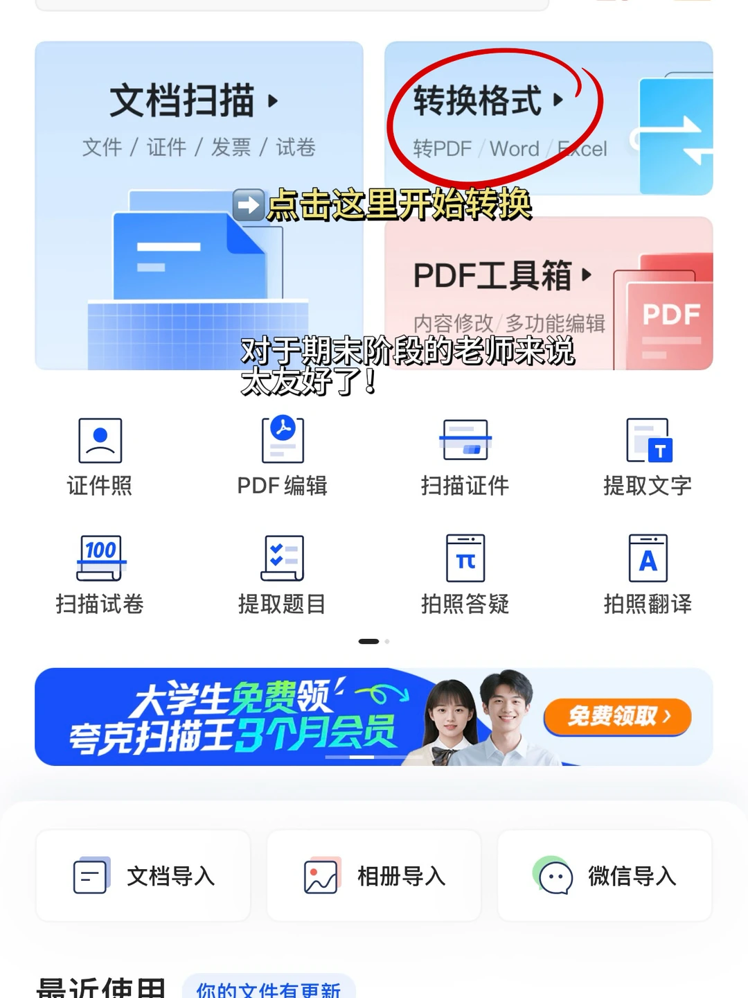 "【打开夸克扫描王——点击转换格式——导入文件】