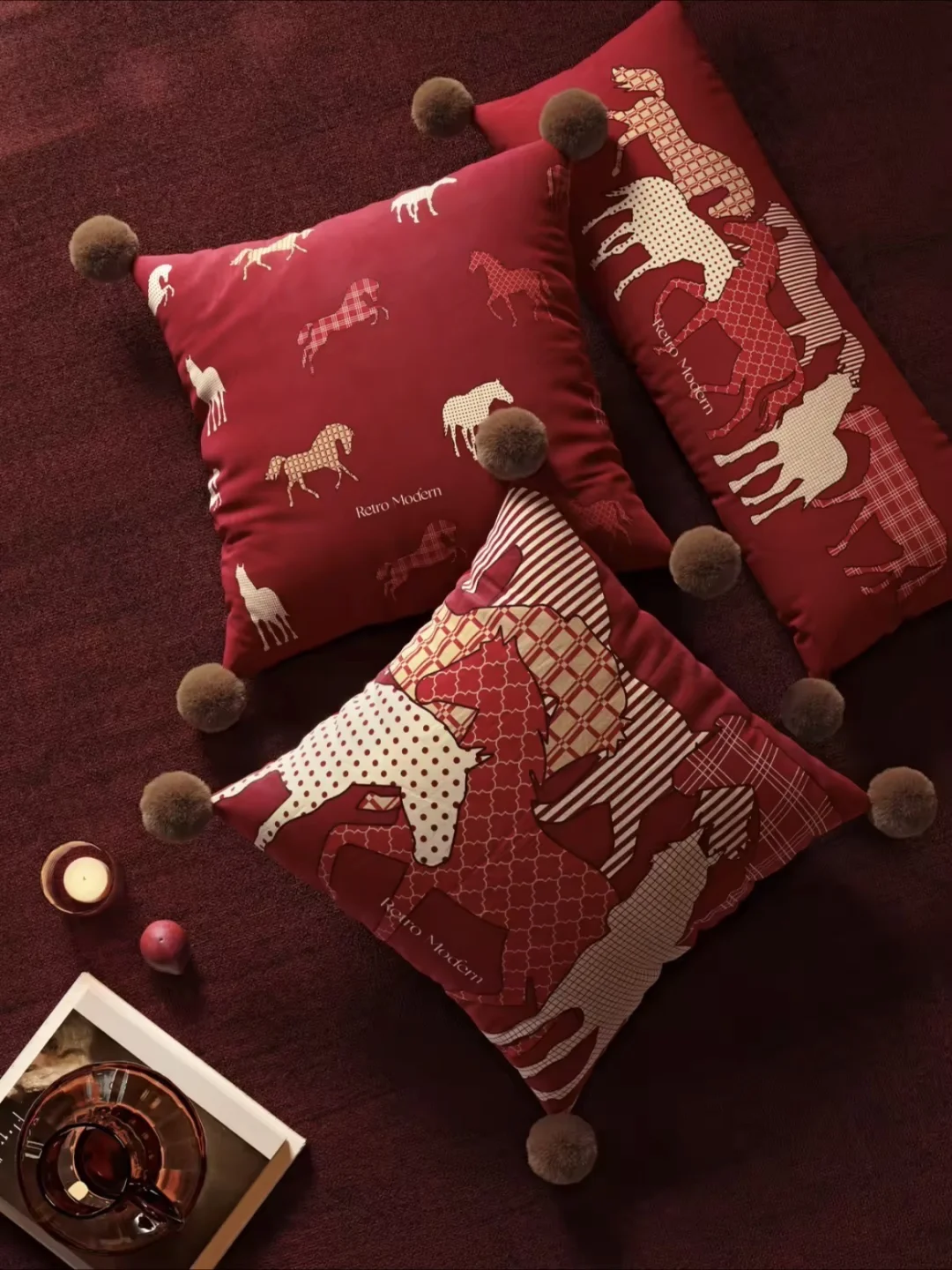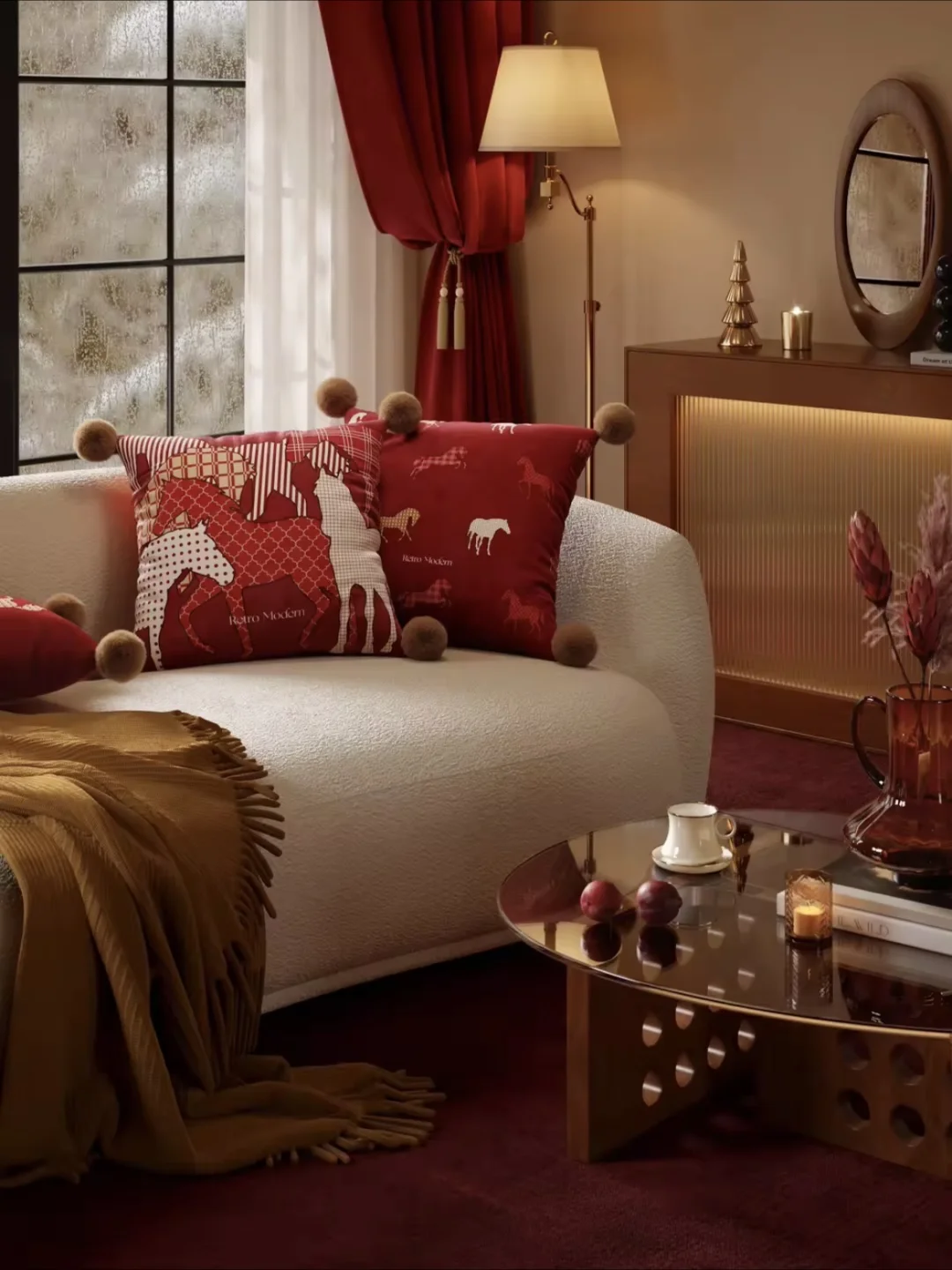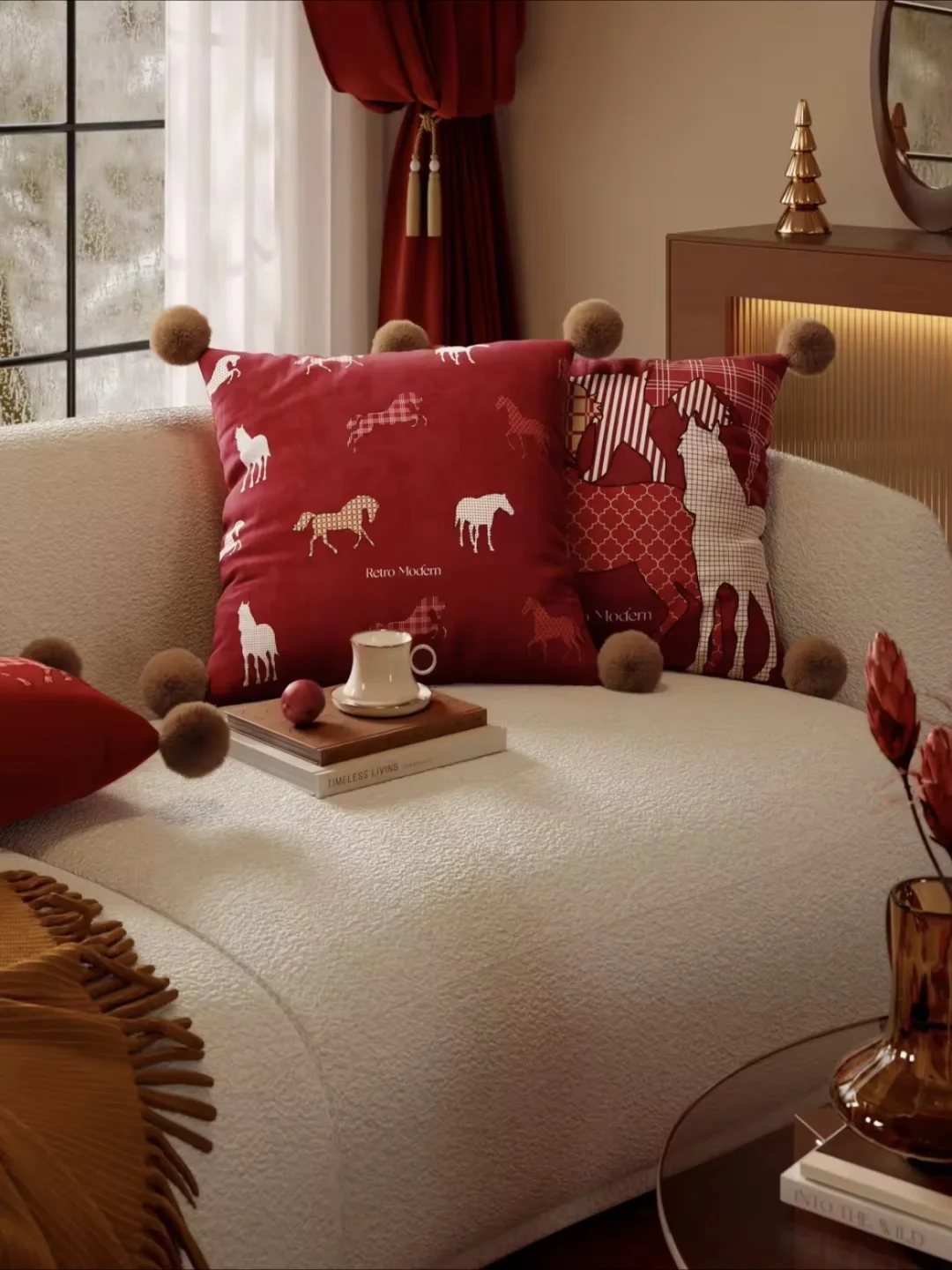 这款小马造型抱枕 以几何纹样重新演绎骏马姿态 选用苹果酒红与肉桂棕作为主色调 温暖浓郁,很适合冬季家居氛围 自然透出节日的暖意与低调的精致感 设计既呼应马年的传统寓意 也为现代家居空间带来一点轻松的艺术感 -