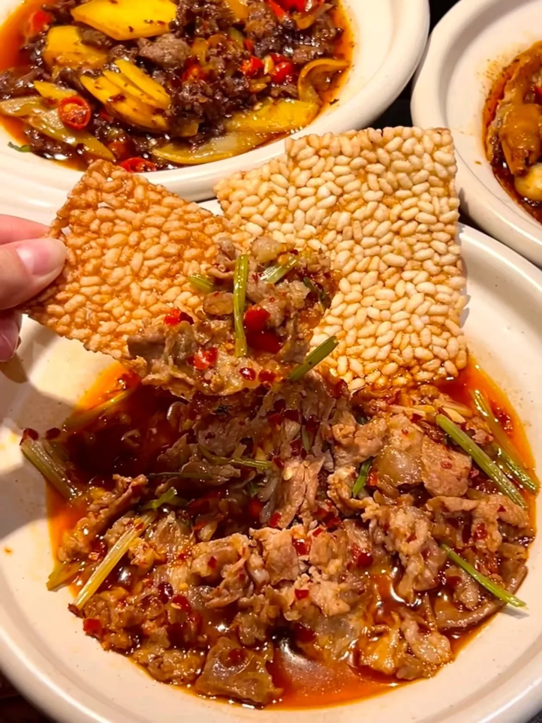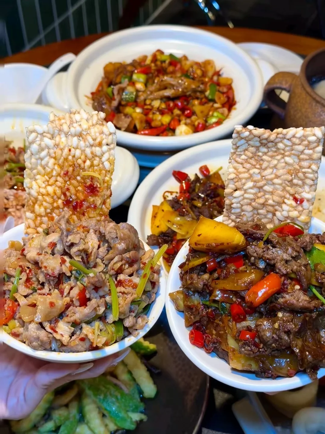 ✅ 锅巴牛肉:锅巴吸满了辣油和肉香,咬下去嘎嘣脆,又香又辣超下饭!