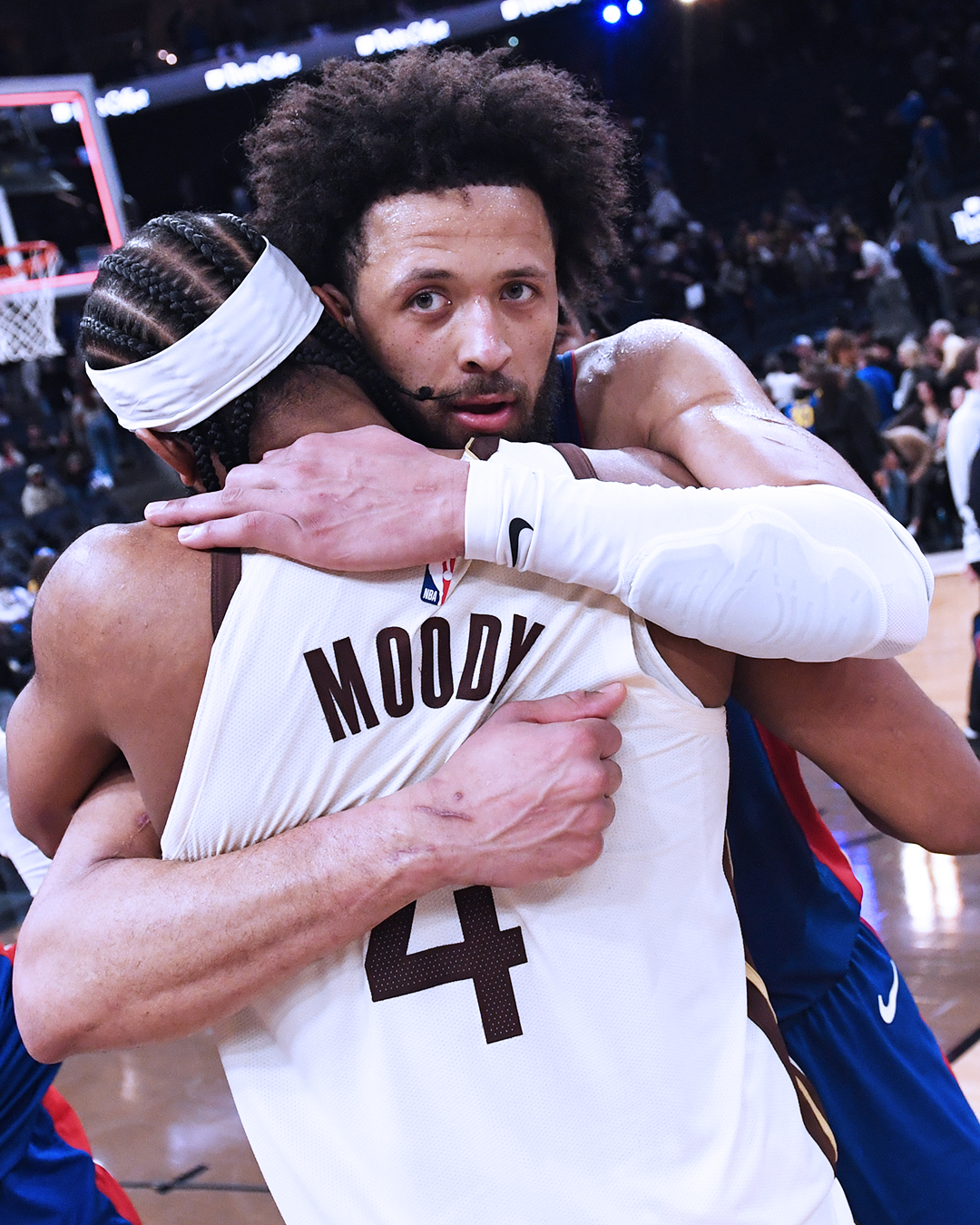 从高中室友到NBA赛场,穆迪昨日赛后与坎宁安拥抱致意🤝活塞vs勇士