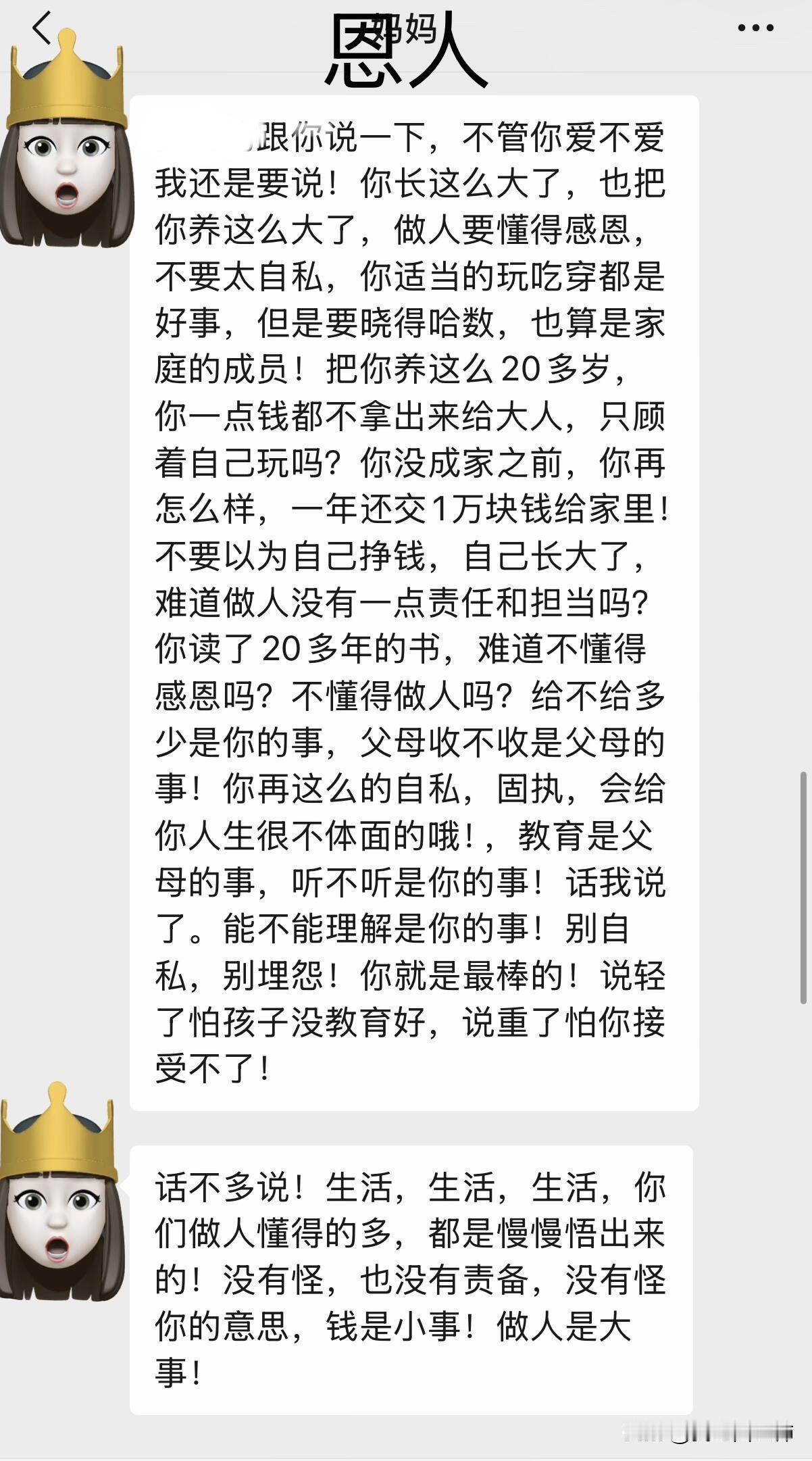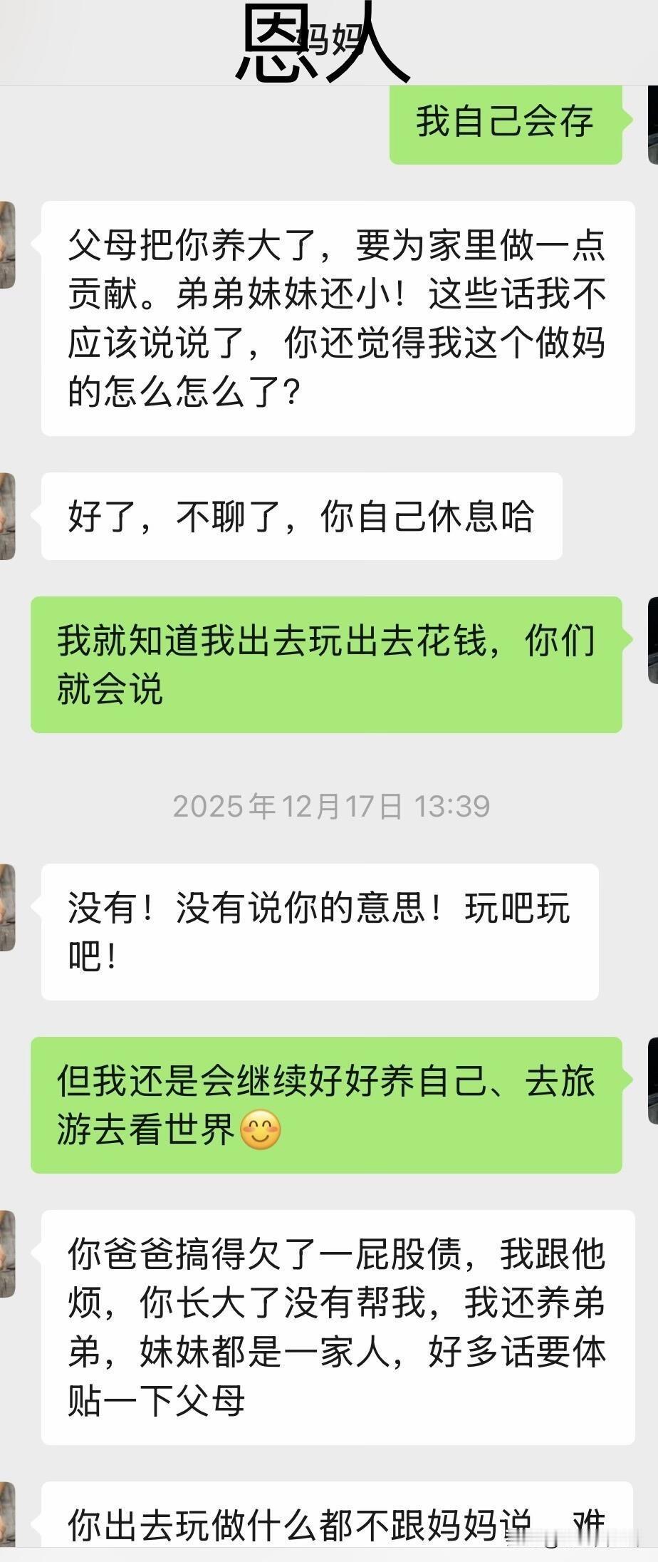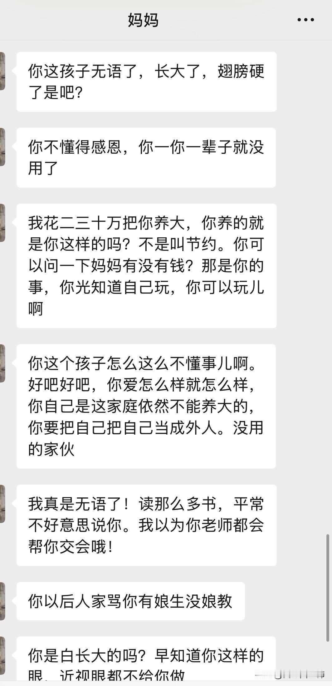继上个月去澳门玩,被她看到朋友圈后 被她看到朋友圈,就跑来问我,我就知道她三句不离钱 (我爸欠债,是之前我爸搞投资,借钱、刷信用卡我妈不知道,知道了之后跟他闹着要离婚,但气消了还是帮我爸还钱,已经还了5万,基本上已经不欠了)我之前提前过我爸,让他不要搞那些东西,他没有听,6月份说信用卡没钱还 向我要3000 我立马转给他了…换来我妈一句“3千而已,多大个事”真的失望