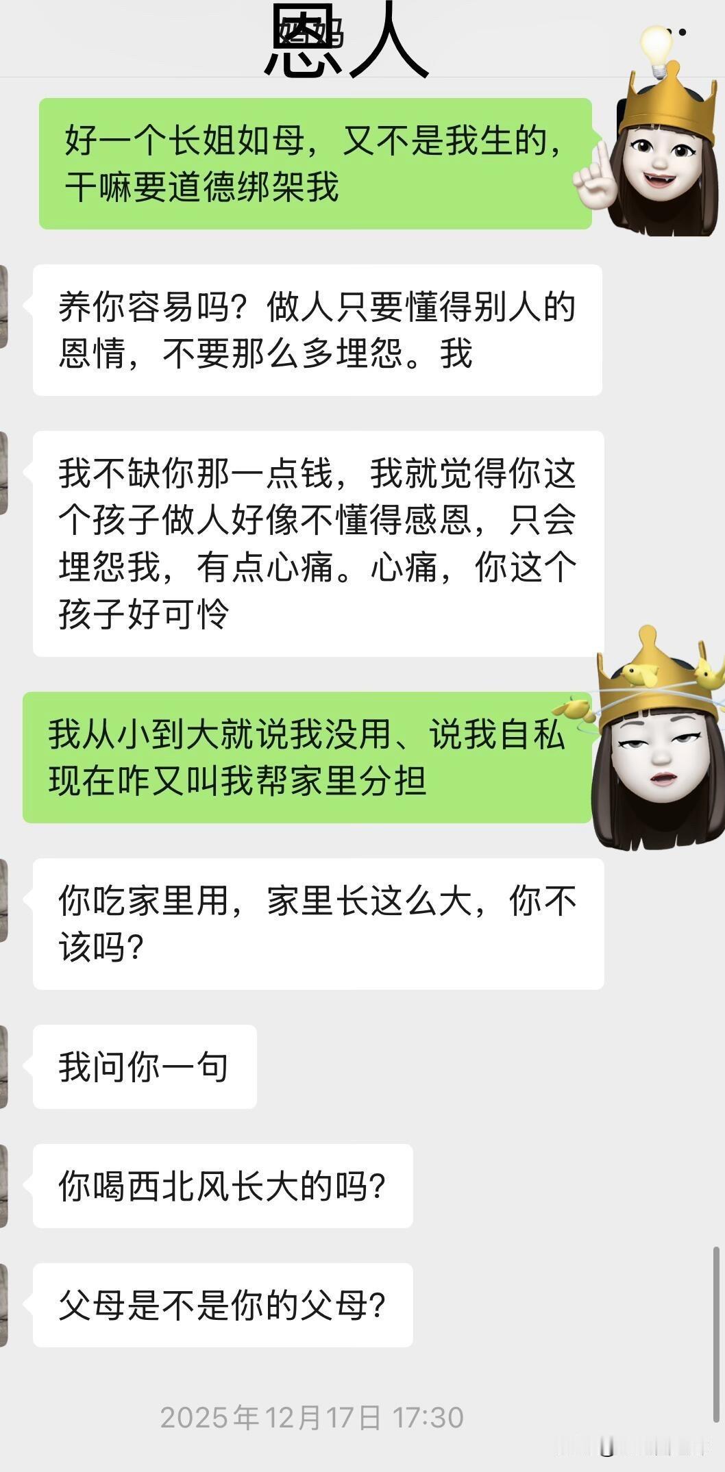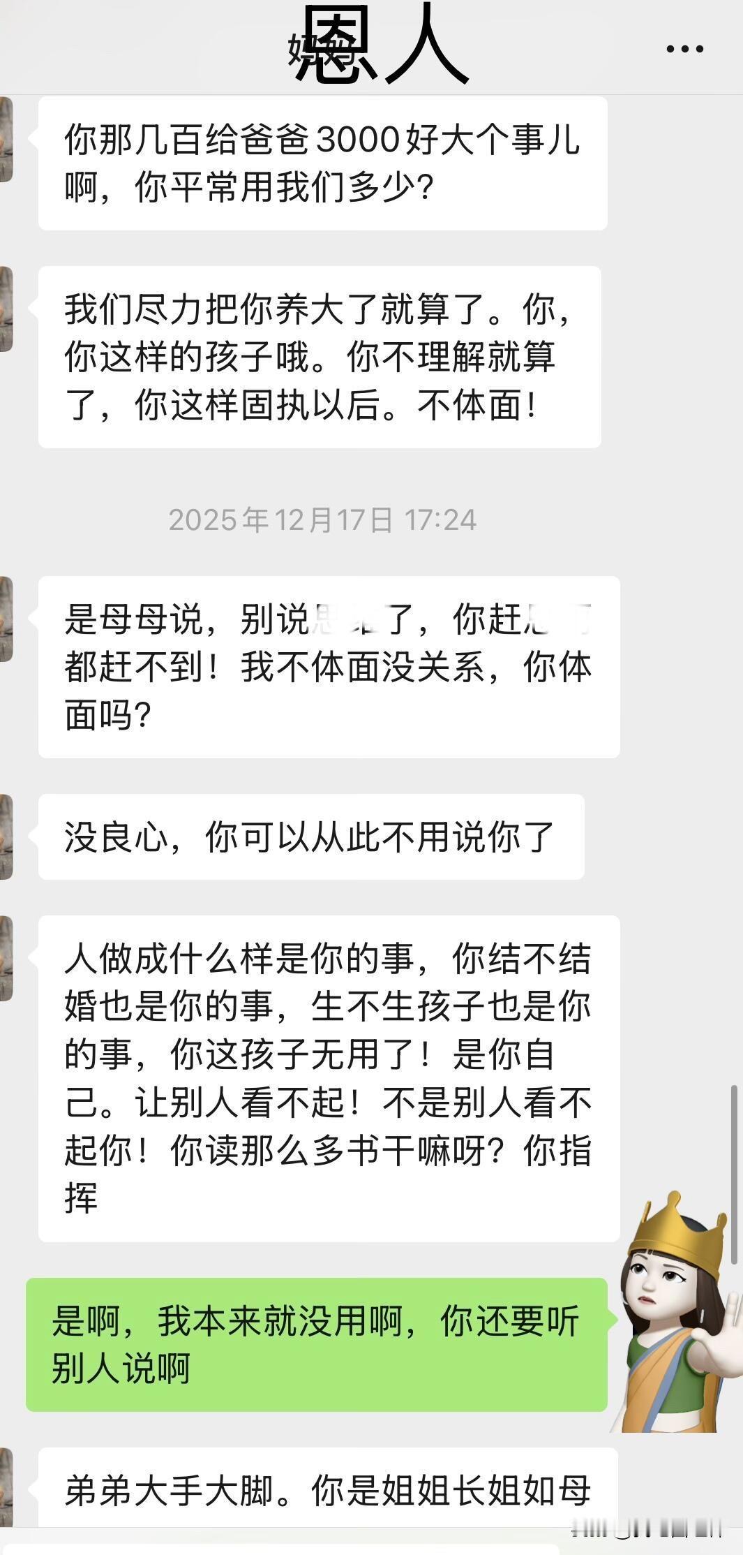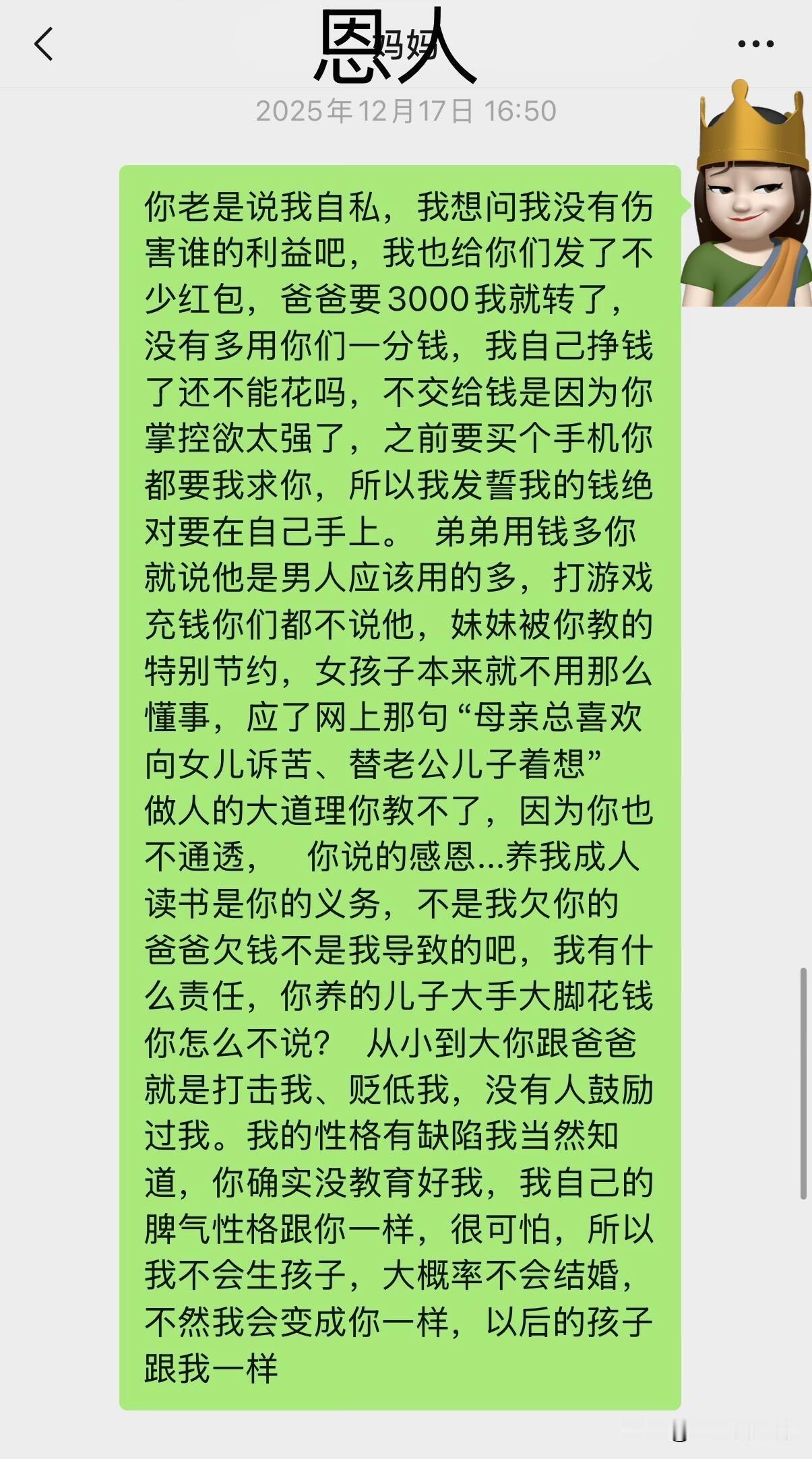 继上个月去澳门玩,被她看到朋友圈后 被她看到朋友圈,就跑来问我,我就知道她三句不离钱 (我爸欠债,是之前我爸搞投资,借钱、刷信用卡我妈不知道,知道了之后跟他闹着要离婚,但气消了还是帮我爸还钱,已经还了5万,基本上已经不欠了)我之前提前过我爸,让他不要搞那些东西,他没有听,6月份说信用卡没钱还 向我要3000 我立马转给他了…换来我妈一句“3千而已,多大个事”真的失望