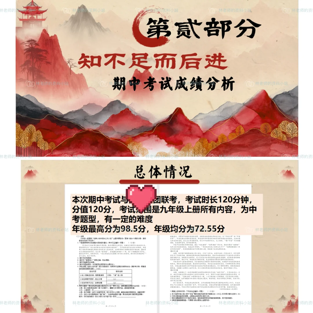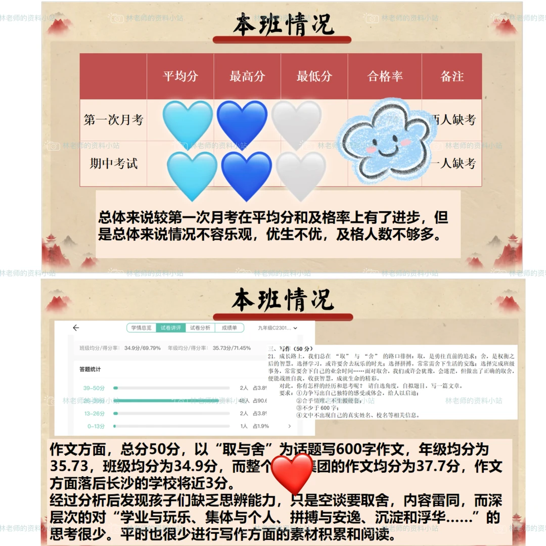 三、期中考试成绩分析(反思然后才能进步嘛,主要讲阅读和作文方面的问题,鼓励表彰平时语文学习认真的孩子)