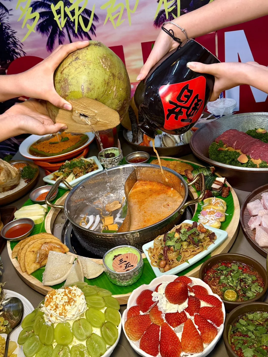 一边是新鲜现开的椰子水锅底,清甜爽口;
