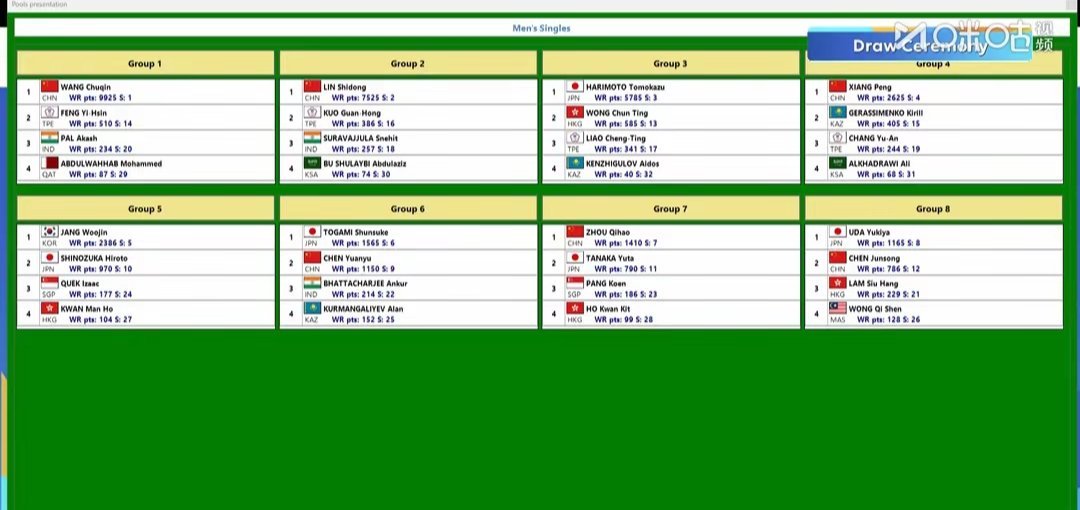 国乒阵营中,卫冕冠军、头号种子王楚钦坐镇第一组,伤愈复出后状态回暖,将迎战中国台北选手冯翊新、印度选手阿卡什·帕尔及卡塔尔选手穆罕默德·阿卜杜勒瓦哈卜;本土作战的林诗栋身处第二组,虽近期受伤病困扰,但主场优势或助其突破低谷,对手包括中国台北选手郭冠宏、印度选手斯内希特·苏拉瓦朱拉及沙特阿拉伯选手阿卜杜勒阿齐兹·卜·舒莱比。向鹏、陈垣宇、周启豪、陈俊菘分别落位第四、六、七、八组,其中近期斩获WTT赛事冠军的周启豪状态正盛,将对阵日本选手田中佑汰等,新生代小将陈俊菘则迎来亚洲杯首秀,需直面日本选手宇田幸矢等强手,考验十足。