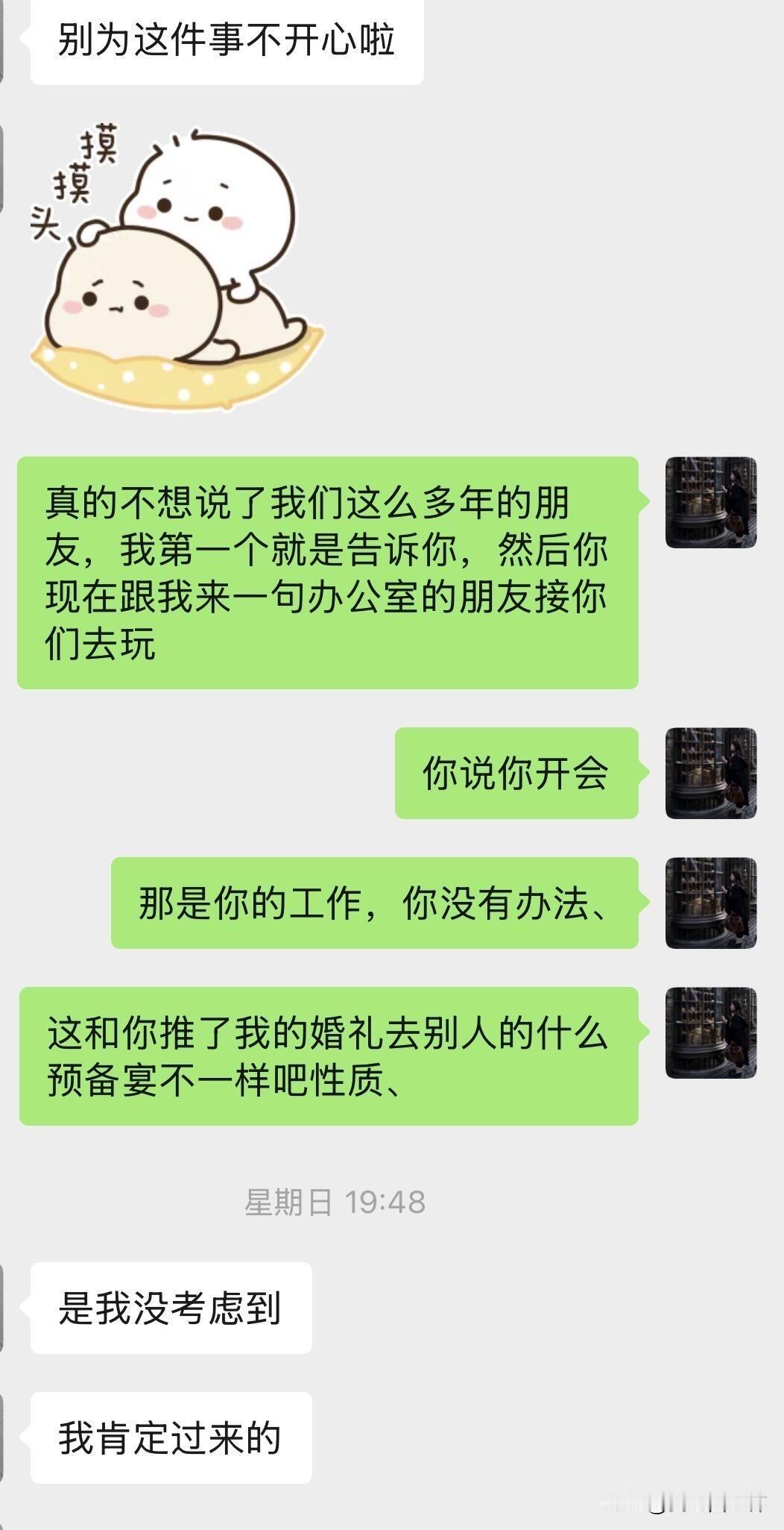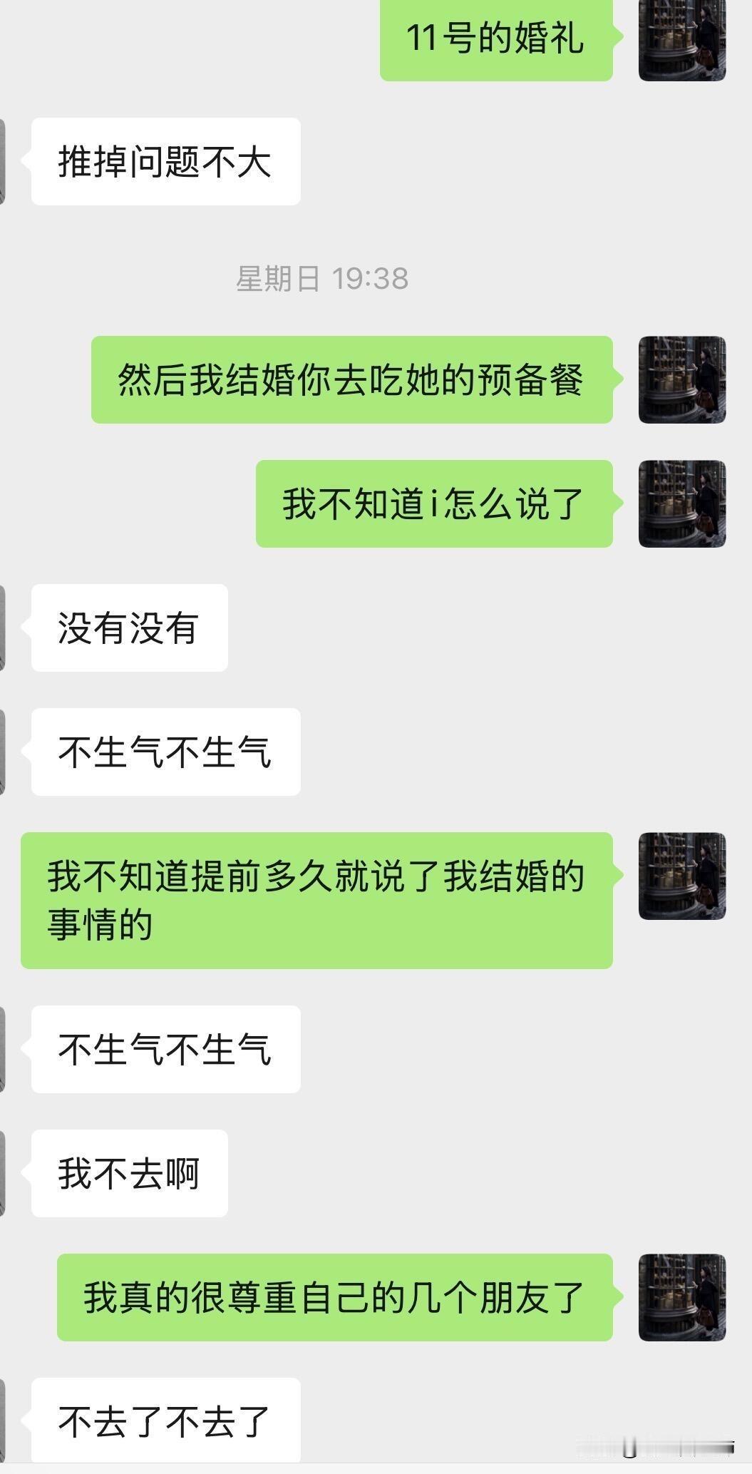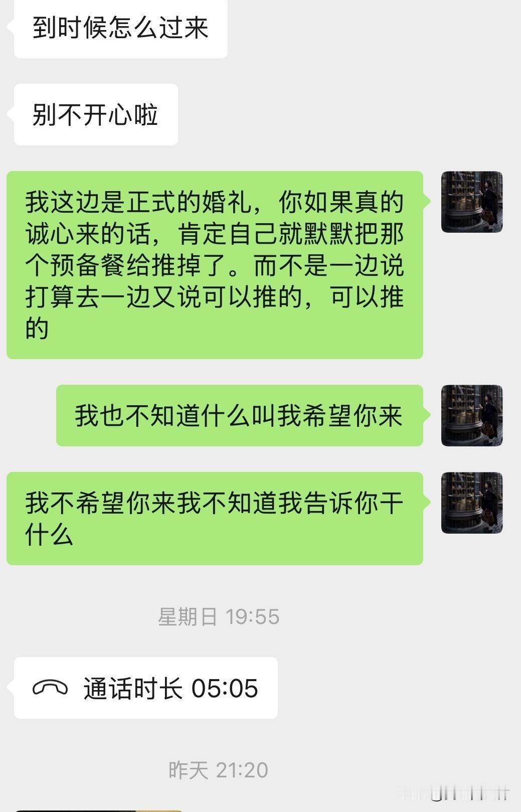 “二十几年闺蜜”在我结婚前三天来这一出 我十一月就定了婚期告诉了我最好的闺蜜,星期三的时候问她要不要化妆师化妆她就说不想早起所以自己化,(这时候我就知道比较完蛋了)。 我结婚前三天的时候先是说要去参加同事的预备宴不能来女方的婚礼了,(之前我闺蜜有打电话说学校可能要开大会来不了女方这边的婚礼,我说那没事的因为这是工作需要,我觉得这个和为了同事的预备宴不来女方婚礼性质不一样。)后面见我不高兴又说推了同事的还是来我这里,第二天又跟我说阳了可能要打针了肺炎了,我就说那要不我让我朋友来替伴娘,她又坚持要做伴娘让我等她检查结果,没有肺炎就可以做伴娘,后面她又回我电话说可能会住院,那我就说是不是结婚那天都来不了了,这时候我的情绪有点不好,一想到她来不了我婚礼我心里还是很难过的,有一个二十年的朋友真的不容易。然后我闺蜜就让我不要情绪化,不要有情绪好好解决问题哈哈,不知道哪个新娘遇到这种情况会没有情绪的哈。 挂了这个电话半夜又发信息给我说自己委屈,但是还是要来当伴娘让我放心。介于以前我闺蜜临时放我鸽子的情况太多我还是打电话给我朋友了,我朋友很爽快地答应了顶我闺蜜的伴娘。 结果今晚给我打电话说这二十年来都好委屈,说她每次跟我打电话都不开心,(?不开心为什么还要经常给我打电话?因为无人听她说工作的委屈无人听她说生活的苦闷?),还说今年和我一起出去旅游的时候感觉挺好,说我那次表现得好哈哈哈哈哈太搞笑了,但是我其他时候表现得不好,我一个ok挂了电话反手一个拉黑。 我闺蜜抑郁症严重,可能有时候自己憋着情绪,但是这不足以作为攻击我的理由,也绝不是结婚闹这一出的借口。
