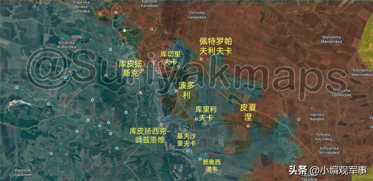 2月3日俄乌最新战报: 1.苏梅州前线: 过去两周里,俄军扩大了米罗皮尔利亚以东方向的俄乌边境缓冲区(图一)。 2.哈尔科夫州前线: ①过去三天里,俄军继续在奥斯基尔河东岸扩大其作战行动。他们将乌军从皮夏涅村的剩余区域驱赶至铁路沿线(图二)。 ②俄军已渗透至新奥西诺韦村,但遭乌军击退(图二)。 ③俄军从波多利村方向进入库里利夫卡村,从该方向抵达铁路沿线(图二)。 3.红利曼方向前线: ①过去11天里,俄军控制了斯塔夫基村的大部分地区,并推进至南部战壕(图三)。 ②俄军继续在科罗维·亚尔村和奥列克桑德里夫卡村周边展开行动,直逼两地之间的公路(图三)。 4.索莱达尔方向前线: 俄军继续在普里维利亚村展开行动,进入了戈卢比夫卡村,并逼近费多里夫卡-德鲁哈村(图四)。 5.红军村方向前线: ①过去一周里,俄军在赫里什涅村取得了主动权,控制了该村东部区域,并向中心区域推进(图五)。