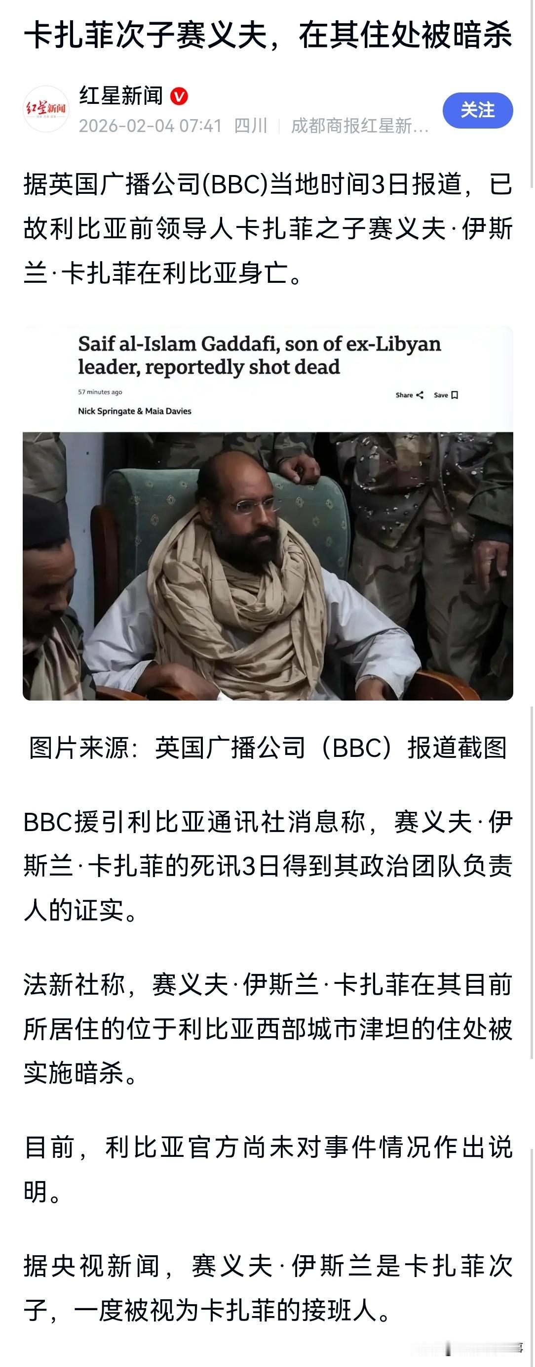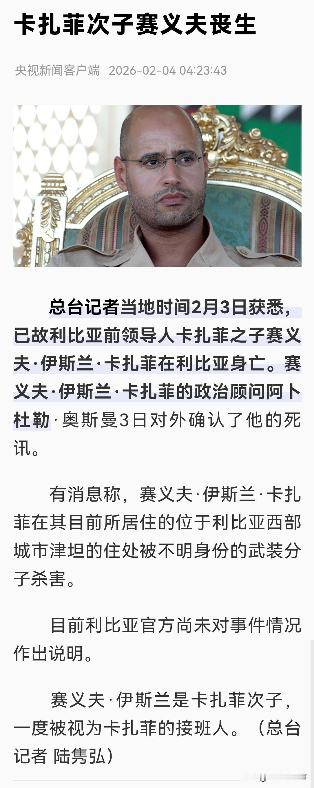 利比亚前领导人穆阿迈尔·卡扎菲次子赛义夫·伊斯兰·卡扎菲于昨天和今天被多个媒体和信源证实死亡,时年53岁。 目前,利比亚官方尚未对事件情况作出说明。