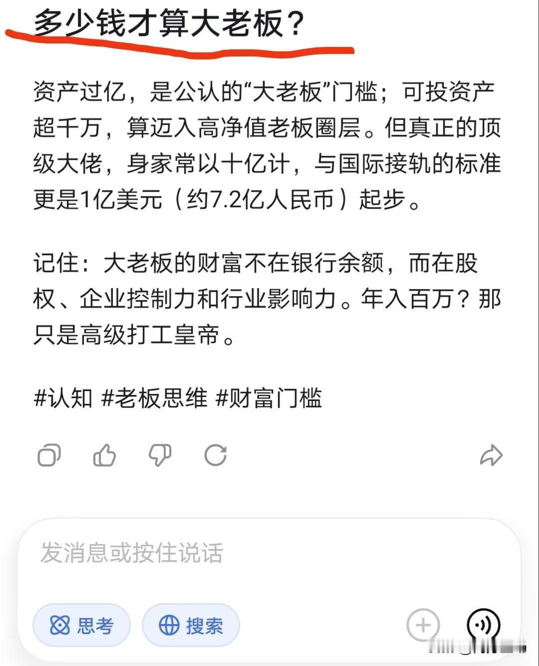 问deepseek,多少钱才算大老板? 资产过亿,是公认的“大老板”门槛;可投资产超千万,算迈入高净值老板圈层。但真正的顶级大佬,身家常以十亿计,与国际接轨的标准更是1亿美元(约7.2亿人民币)起步。 记住:大老板的财富不在银行余额,而在股权、企业控制力和行业影响力。年入百万?那只是高级打工皇帝。 (图片来源于网络) deepseek 企业富豪