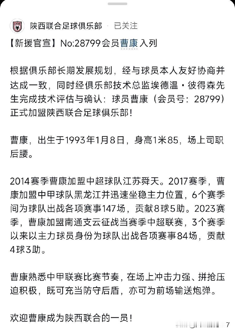 俱乐部这官宣就像下饺子[捂脸],一个一个的来。这不后腰曹康又来了[耶]欢迎欢迎。