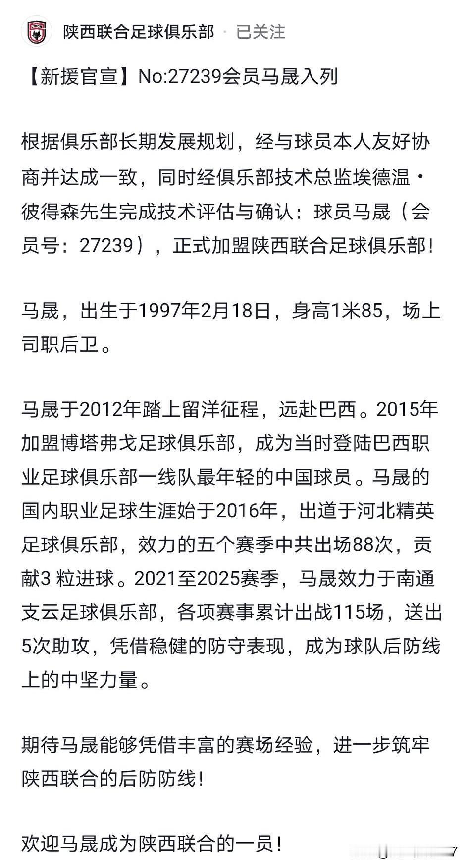 今天陕西联合又官宣了一个新球员,西北狼后防线球员随着马晟的加盟陕西联合,在上赛季让球迷诟病的后防线。今年应该能有所提升,那就让大家拭目以待吧!