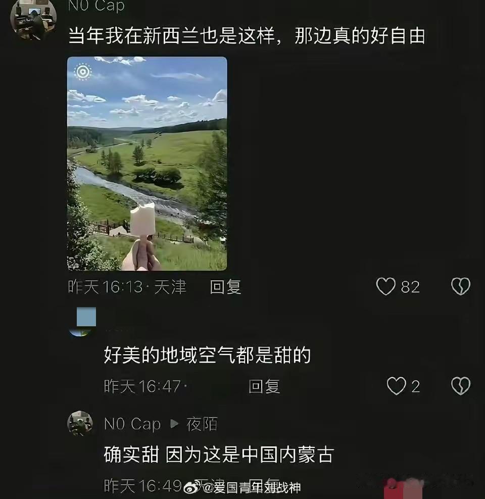 为什么直钩钓鱼,往往一钓就是一连串的歪嘴儿反贼…[捂脸] 一张内蒙古草原的照片说新西兰为什么仍然坚信? 因为这些反贼润到国外后,长期自己给自己洗脑,然后互相报团洗脑,再加上前几年一些国外媒体恶意抹黑,所以在这些反贼心里现在的中国自然环境恶劣人为破坏严重,只有“自由的西方”才配得上蓝天白云绿草青青… [大笑][大笑][大笑] 朋友们,你们对此事怎么看? 欢迎大家在评论区探讨,留言…[送心]