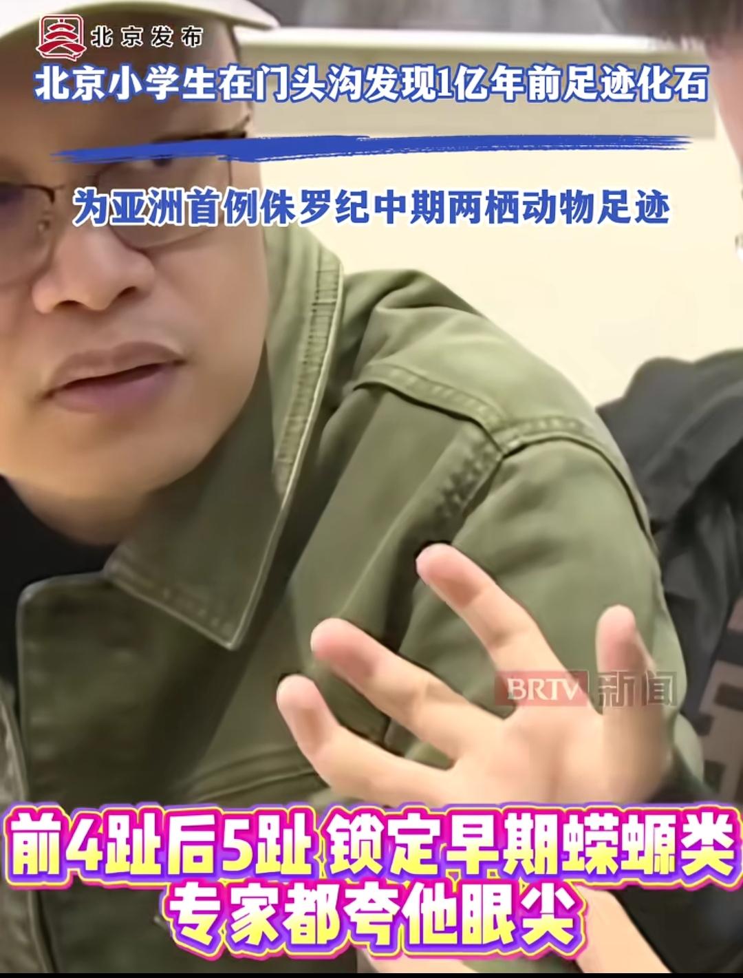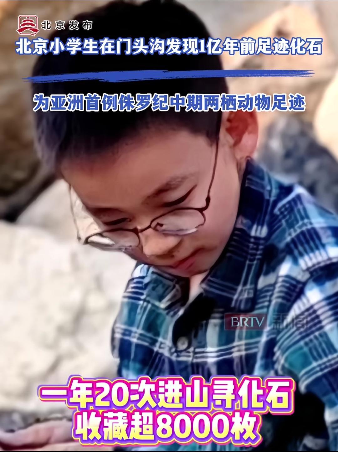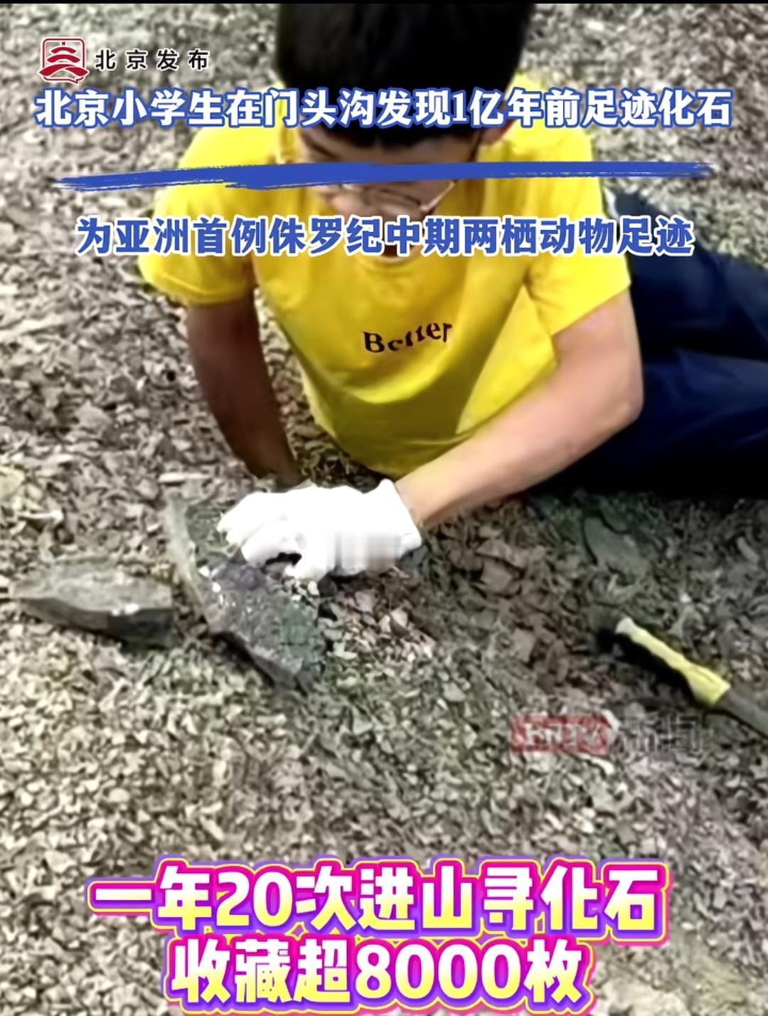自古英雄出少年,北京一小学生发现亿年前两栖动物足迹化石。 (如图所示)当大多数的孩子还在玩乐的时候,北京一小学生每年进山二十多次,在门头沟的大山里,以寻找石头为乐趣,收藏超八千枚各类化石,其中包括珍贵的亿年前两栖动物的足迹化石。就不知道这种孩子,家长是怎么培养出来的,真是人才呀!