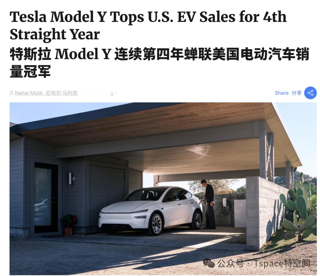 据外媒统计,2025年特斯拉Model Y和Model 3包揽美国电动车销量榜前两位,其中Model Y更是连续第四年成为美国最畅销的电动车型,其单一车型的年度销量甚至超过榜单中其他品牌车型销量总和。