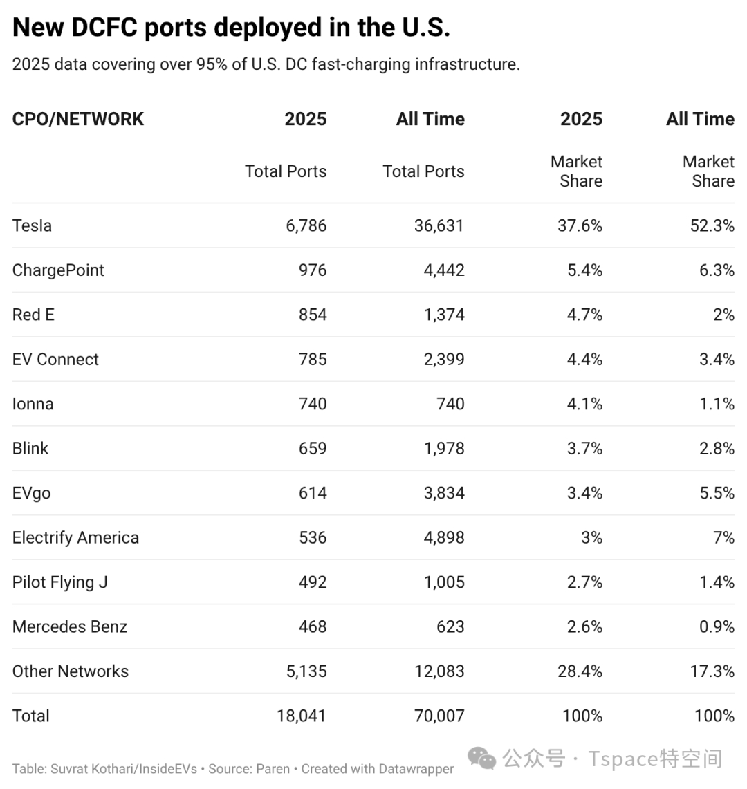 2025年美国电动车公共快充网络增幅破纪录,当地每两个快充桩里就有一个是特斯拉的