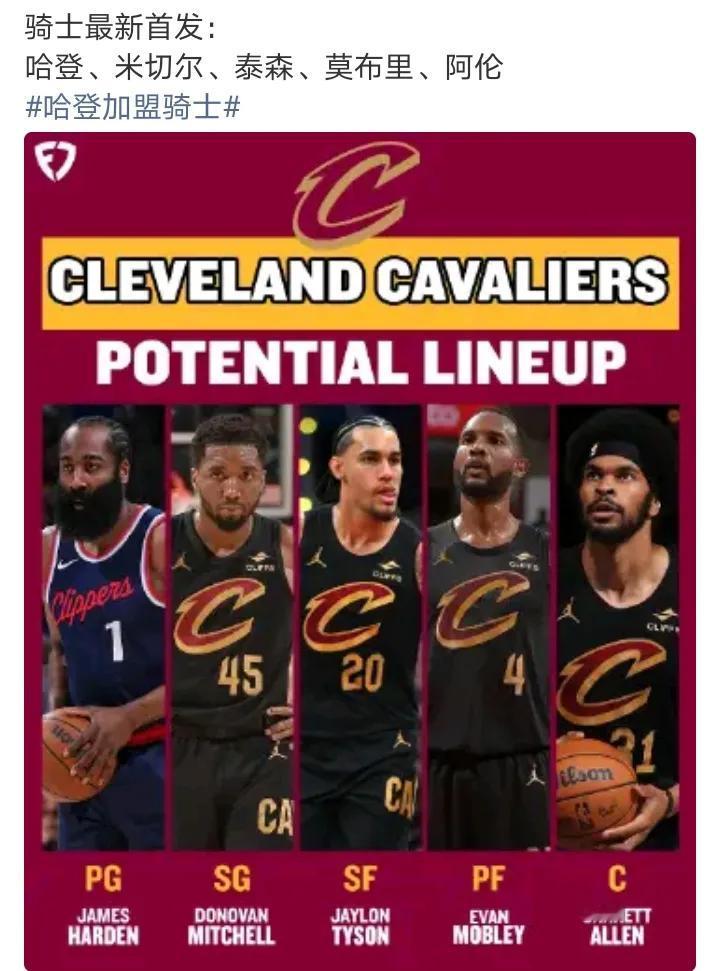 登子实力不错的 这阵容有机会冲出东部 骑士最新首发:哈登、米切尔、泰森、莫布里、阿伦。这阵容真扎实,骑士今年怎么说也要进个东部决赛了吧,有登哥这传球大师,米切尔的得分能力,直接起飞,实话实说这套阵容很强,老中青三代都有。攻防组织全都在线。这套阵还是止步二轮的话,米切尔包括哈登就证明没夺冠那个命了。