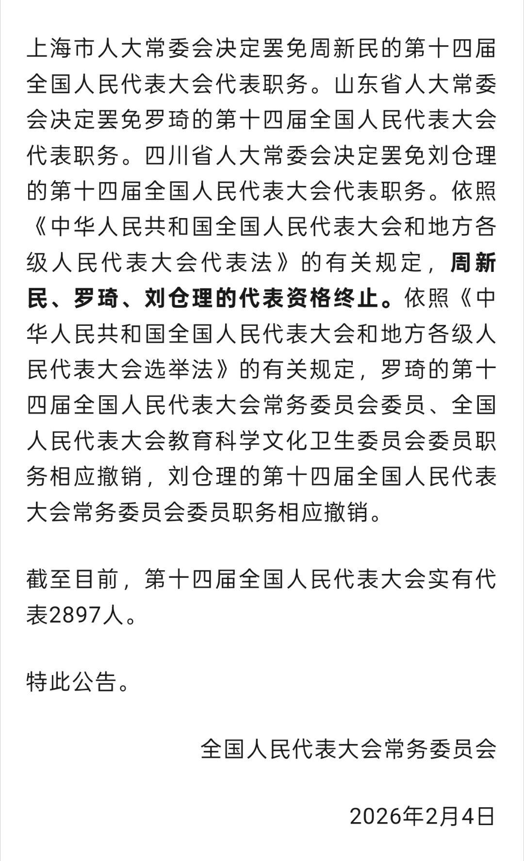 今天的公告:周新民、罗琦、刘仓理的人大代表资格终止。