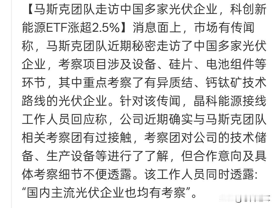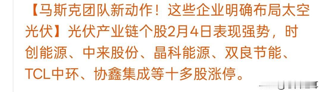 拯救光伏企业的不是自救,不是反内卷,而是马斯克 A股市场又在上演一股无脑炒作了,光伏板块最近因为一个男人迎来了暴涨,今天整个板块大涨5.18%,有十支股票涨停。 因为马斯克团队来国内考察,寻求合作,为它的10万颗星链卫星寻找太空光伏。这也造就了市场新的板块崛起。 这些年来,光伏板块经历大起大落,大家无节制的扩充产能,导致光伏行业产能严重过剩,企业亏损一个比一个厉害。面对光伏行业困境,国家也提出反内卷,缩产能,取消出口退税等措施。 在这一系列措施下,收效甚微,整个板块走势也起起伏伏,整体波澜不惊。 但是最近两天因为一个男人,彻底改变了这一状态。 太空光伏真能解决光伏行业产能过剩问题吗? 这或许是一种奢望而已,以我们的产能量,仅仅几十万颗卫星解决不了,除非把月球铺满,才能满足我们的需求。 A股最近两年,从炒老黄变成了炒老马了,今天老黄概念已经开始崩溃,老马的商业航天也是在苦苦出货,大家不要从一个套奔向另一个套,小心为上。