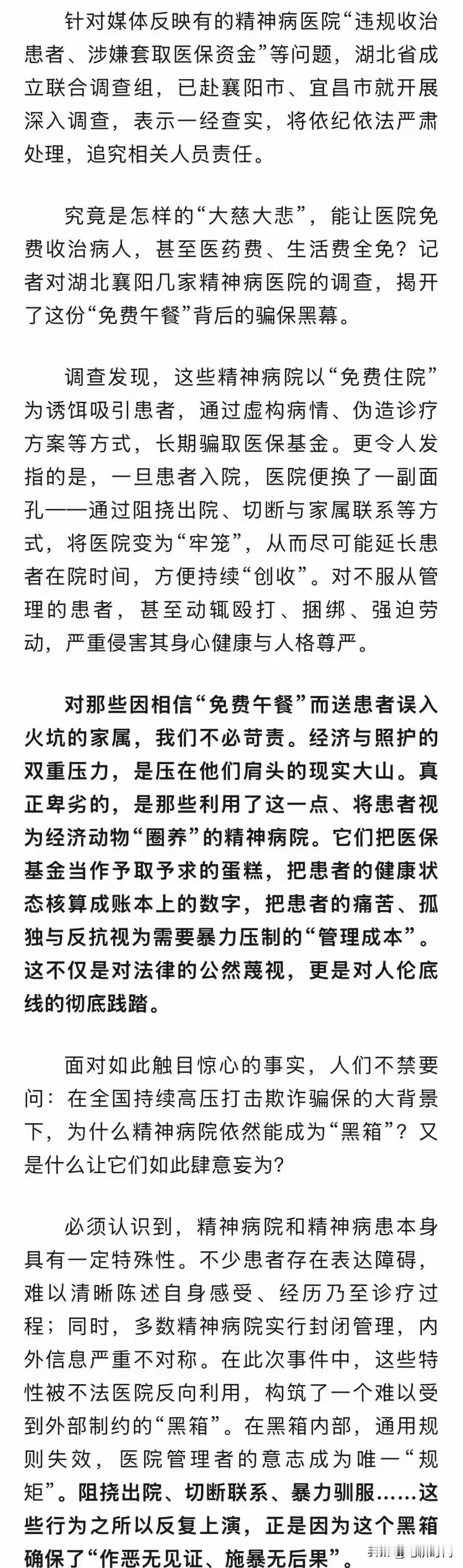 打肿了湖北省的脸!老百姓交个380元的医保费难得要死,这些人搞几百几千万是“儿戏”。没有人无缘无故给你甜头,不要钱或许是最贵的。这话不是没道理。 医药费和生活费全免,给病人家属给出这个承诺。我就不解了,天下哪有这么好的事?他们就这么容易忽悠吗? 把国家的医保基金看成了唐僧肉?这个也许不是个案。说明我们国家的医保基金管理方面有问题,给了不法医院钻漏洞。 除了彻查掀开黑箱盖子,还要查制度原因,到底是什么滋生了这类严重问题。 全国都筛一遍吧,雪不可能只下在一颗树上的。 家属送来就收,不接出不去,相当于坐牢。是医院?还是牢房?为了骗国家医保钱,丧尽天良。 真是人心不古,为了赚钱什么事都做!对有关人员从上到下一定重判。否则不足以平民愤! 智能监控盯着医保钱!医疗行业得回归治病救人的本分。