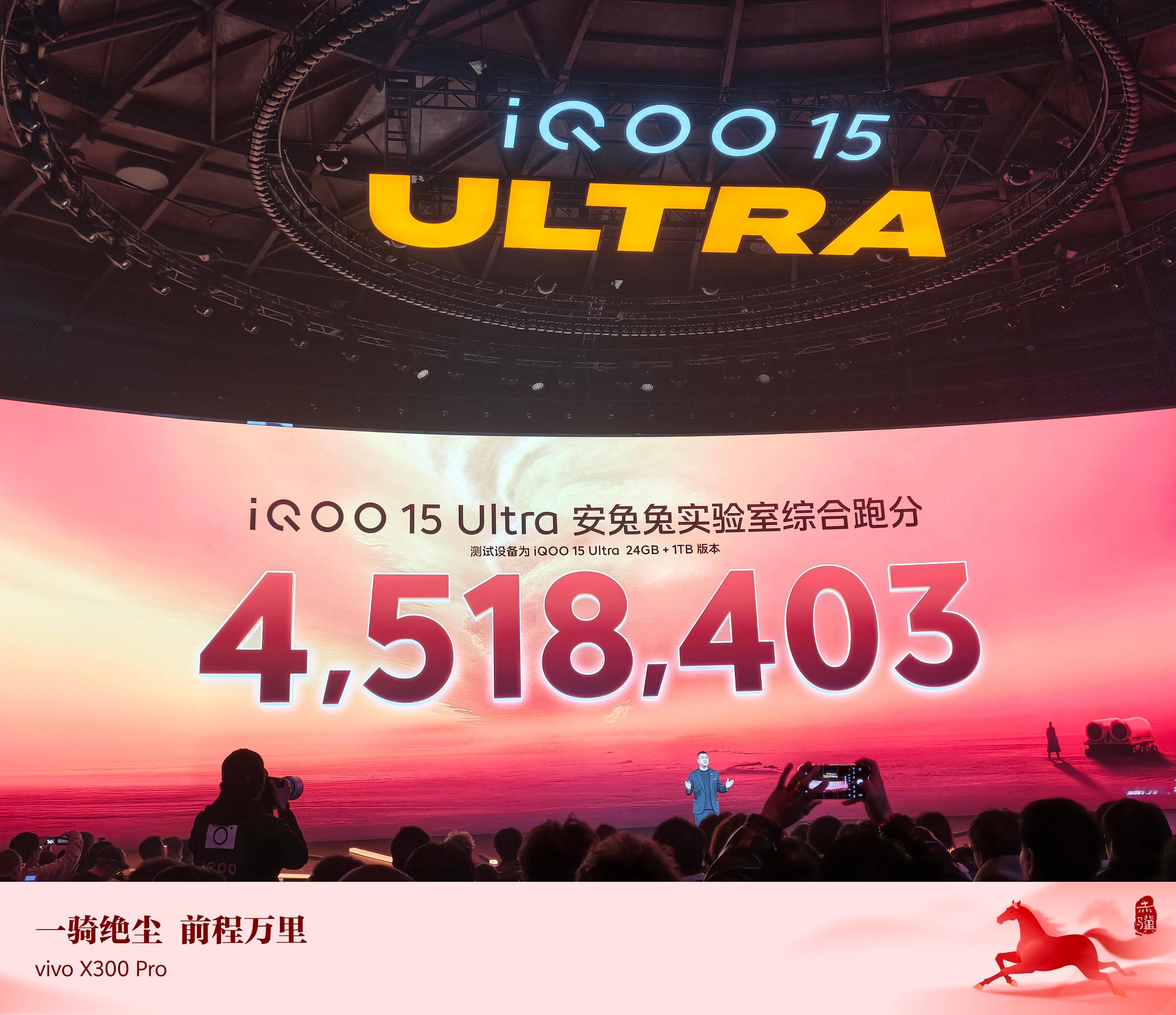 iQOO15 Ultra安兔兔跑分451万,2077,2049两个配色。最高有24+1TB内存版本,内置散热风扇,独家定制冰穹散热风扇,59片扇叶,直径达17x17mm;8000mm²超大VC均热板,双层超高导热石墨;全局一键降温,高能输出更冷静。