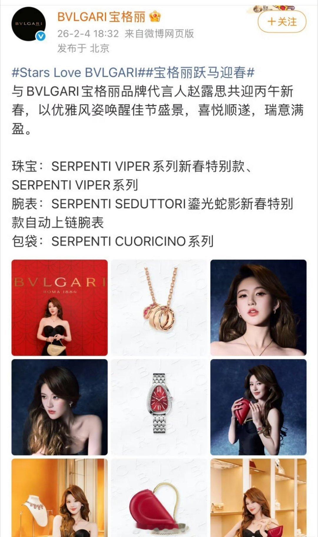宝格丽真的很喜欢赵露思了,直接压轴官宣评品牌代言人赵露思啊,也是合作有一点时间了,真爱赵露思了