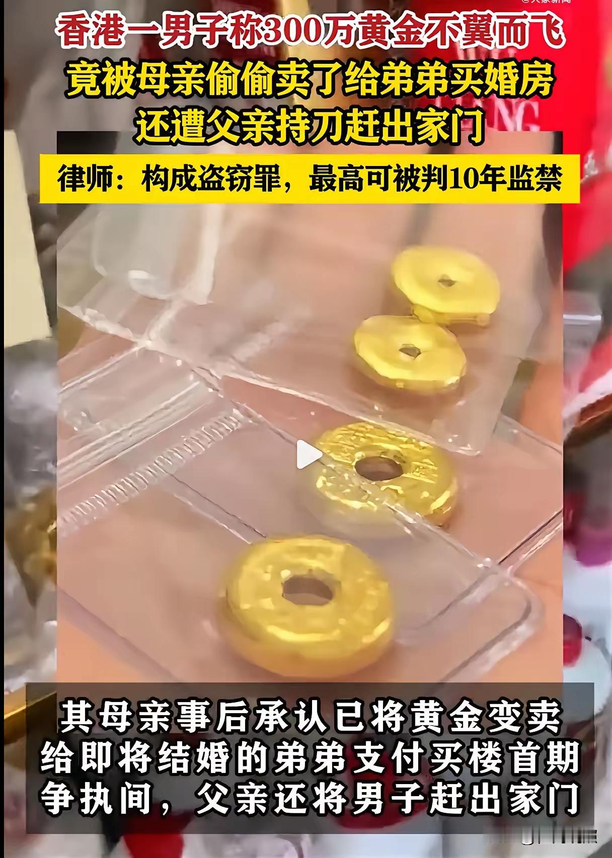 香港男子阿伟省吃俭用15年, 攒下了市值300万港元的黄金, 可金价走高想变卖部分时,却发现保险柜里空空如也。 追问之下才知道,是母亲趁他不注意偷偷卖掉了,钱全给即将结婚的弟弟付了婚房首付,还轻描淡写让他再重新攒。 发生这种事情!即使你不报案,自愿赠予百万婚礼!也是不会感激你!亲情也淡如水啊!相信我,父母生病了要钱的时候还会起诉男子的。 总说手心手背都是肉,可手心的肉就是比手背的厚。😊 媚: 这儿子做得挺好的,最后的一次赠予,给的并非部分黄金,还有给断了这辈子的亲情,对得起任何人! 爹妈是共犯, 让他们一起坐牢,房子就是自己的了, 十年啊,估计会死在牢里。 有人说这是黄金,变相的说,这是闲钱,如果条件允许,亲人困难,我可能会全力帮助,但一定是有商有量,我心甘情愿。偷?坚决不行! 300万你真大方,这么绑的前提是我起码得有3个亿。 涉及到触犯刑法,就不应该按照当事人意愿处置,刑法应该刚性的,触犯了就应该执行,由专业部门负责提起诉讼,而不是把提起诉讼的权利交给当事人自由处理。如果是民事犯罪,那可以由当事人意愿决定是否提起诉讼。 父母偏起心来,连狗都不如,我曾经体会过,十五岁之前,我像个有妈生没妈教的孩子,既尝不到妈妈的半点关心,还时常被当出气筒,每天一小骂,三天一顿打,我的童年在恶梦中度过! 大部分两兄弟的感情只要爸妈不插手别作妖,感情能好到不分彼此的,但是有些父母就是要自作主张的作妖。😊 广东朋友表示:我的情况和他差不多,他是长子,我是长女。我爸妈把所有的。财产。房子,车子.商铺。都跟我弟买好了。我弟在手机上贷款10多万,也是我爸跟他还的。去年我爸在上班的途中被车撞了。 在医院用了18万都是我付的,我在医院照顾了三个月。后来我找律师找对方的肇事者打了官司。我爸成了植物人,官司打赢了过后对方赔了50万。我想把我垫资的钱想要回来。我妈不给我了。我弟拿刀来砍我。现在我弟已经把我拉黑了。