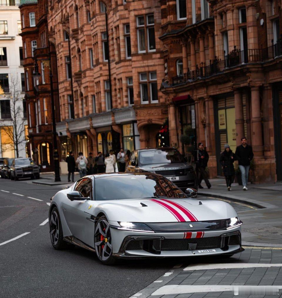 伦敦街头这台银白法拉利太吸睛!红白条纹撞出复古赛道感,流畅线条配英伦建筑,路过都忍不住多看两眼大v聊车