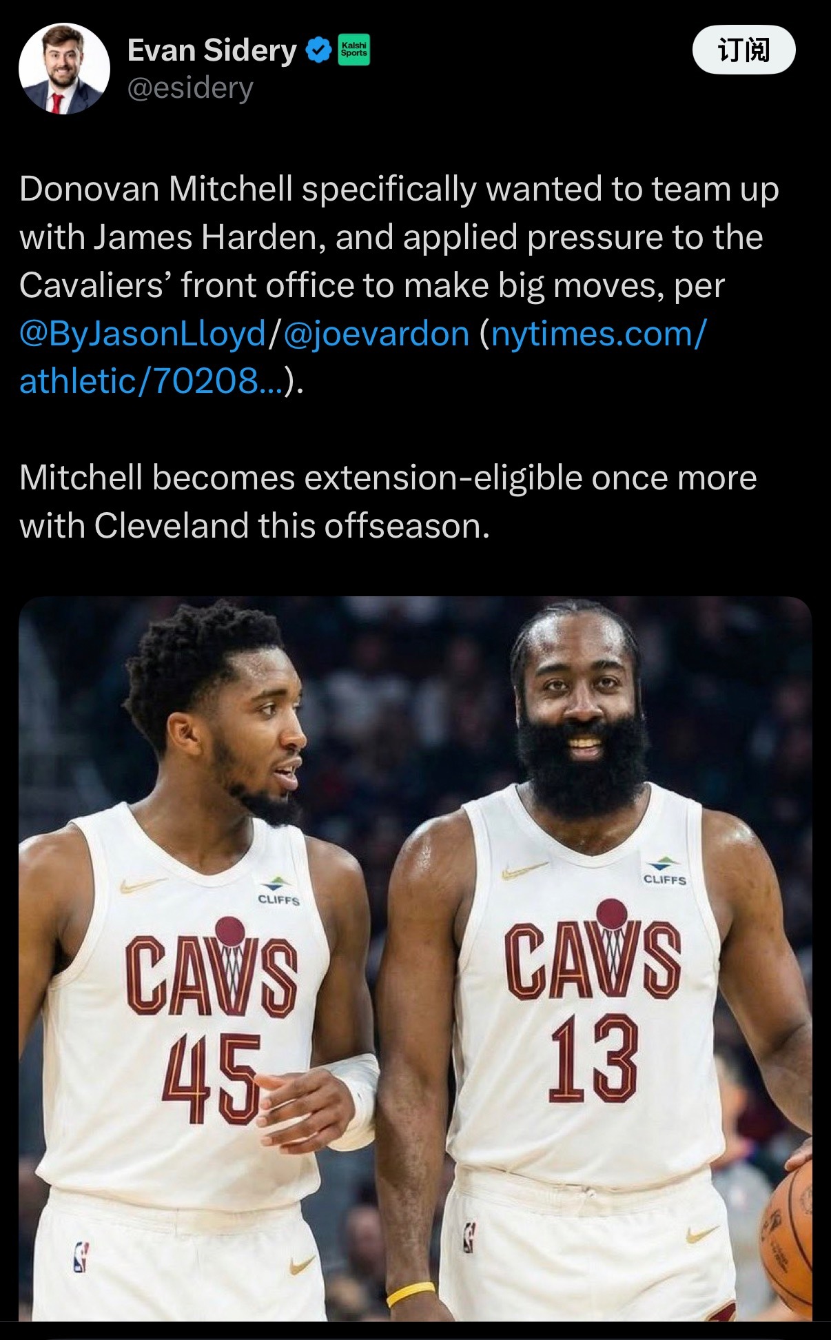 Sidery:多诺万·米切尔明确地(specifically)想与詹姆斯·哈登联手,并向骑士队管理层施压,要求他们做出重大调整。