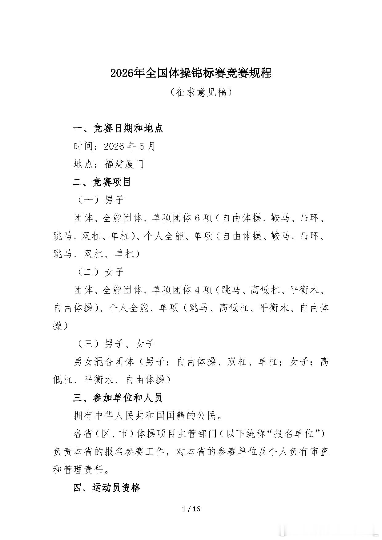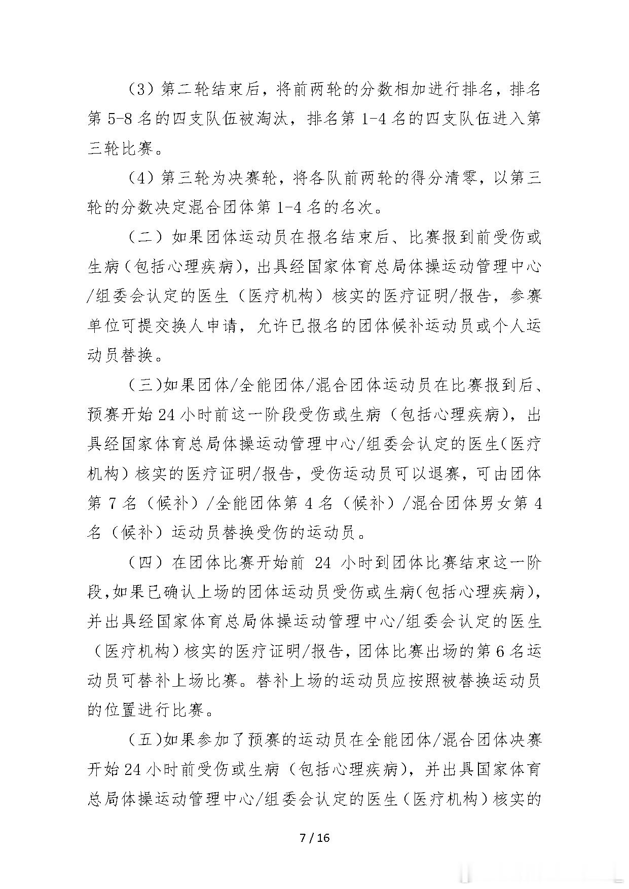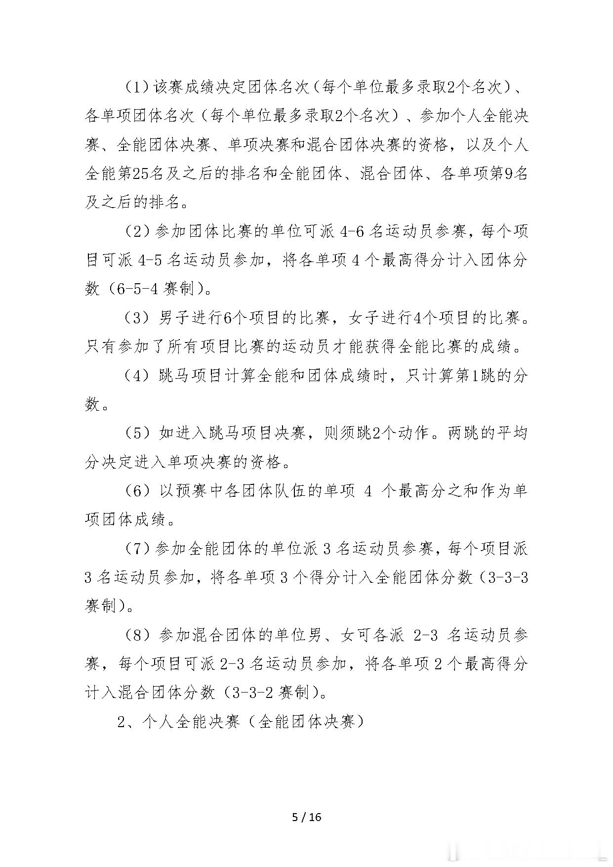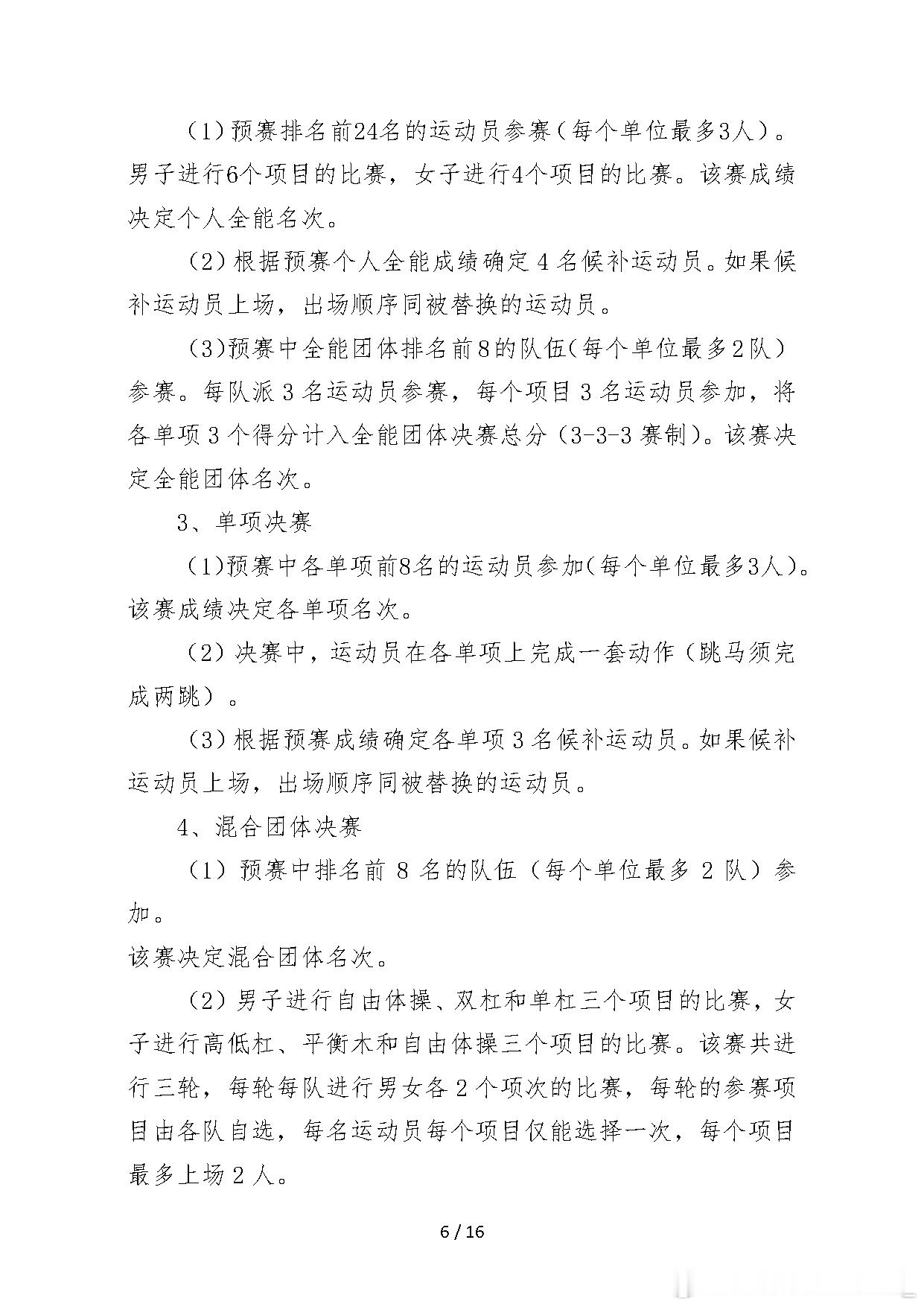 全锦赛 全锦赛竞赛规程征求意见稿公布,资格赛即为团体决赛(6-5-4赛制),但在全能决赛中增设全能团体比赛,另外单设混合团体决赛。全能团体比赛采用3-3-3赛制,即每队选派三位全能选手参赛,三人成绩直接相加进行团体排名,且三人中至少要包含一名年轻选手(男子06-08年,女子10-11年)。混合团体比赛只比男子自由操、双杠、单杠三项和女子高低杠、平衡木、自由操三项,资格采用3-3-2赛制,决赛采用3-2-2赛制。混合团体决赛八支队伍参加,比赛分为三轮,每轮比男女各两项次,但每队的比赛顺序可以自选(优劣势项目的顺序也可能成为胜败关键),每个项目最多上场两人。前两轮结束后,排名前4的队伍晋级第三轮,第5-8名直接淘汰。决赛轮中,前两轮的得分清零,直接以第三轮的分数决定最终名次。