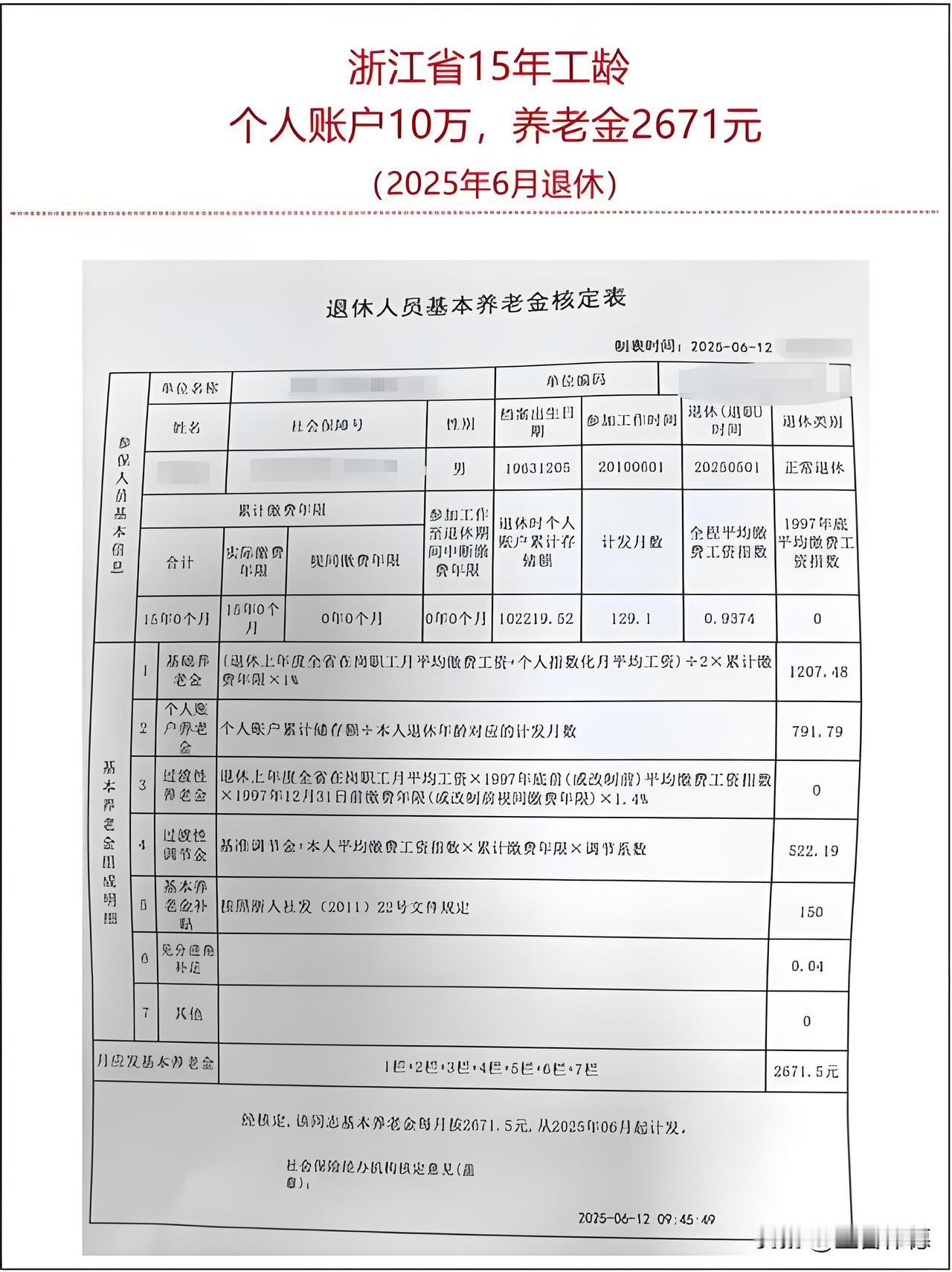 从全国平均水平看,仅缴费15年(最低年限)能领取约2670元养老金,已超过不少省份同类参保人的待遇,主要得益于浙江较高的社平工资与地方补贴(如过渡性调节金522元、补足150元)。这表明浙江省养老金计算基数与福利性调节机制具有明显优势。 然而,在浙江省内,2671元仅处于中等偏低水平。2024年浙江企业退休人员月均养老金已超3500元,且省内生活成本较高,尤其在杭州、宁波等城市,此数额仅可满足基本生活需求。该参保人工龄短(15年)、无视同缴费年限,导致基础养老金(1207元)与个人账户养老金(792元)均不高,主要依靠地方调节政策提升总额。 综上,该待遇反映出浙江省养老金体系在“低缴费年限”情况下仍能提供一定保障,横向对比优于全国多数地区,但纵向在省内属中下水平,实际替代率(养老金与在职工资比)可能偏低,适合基础生活,若居城镇且无其他收入,经济压力仍存。