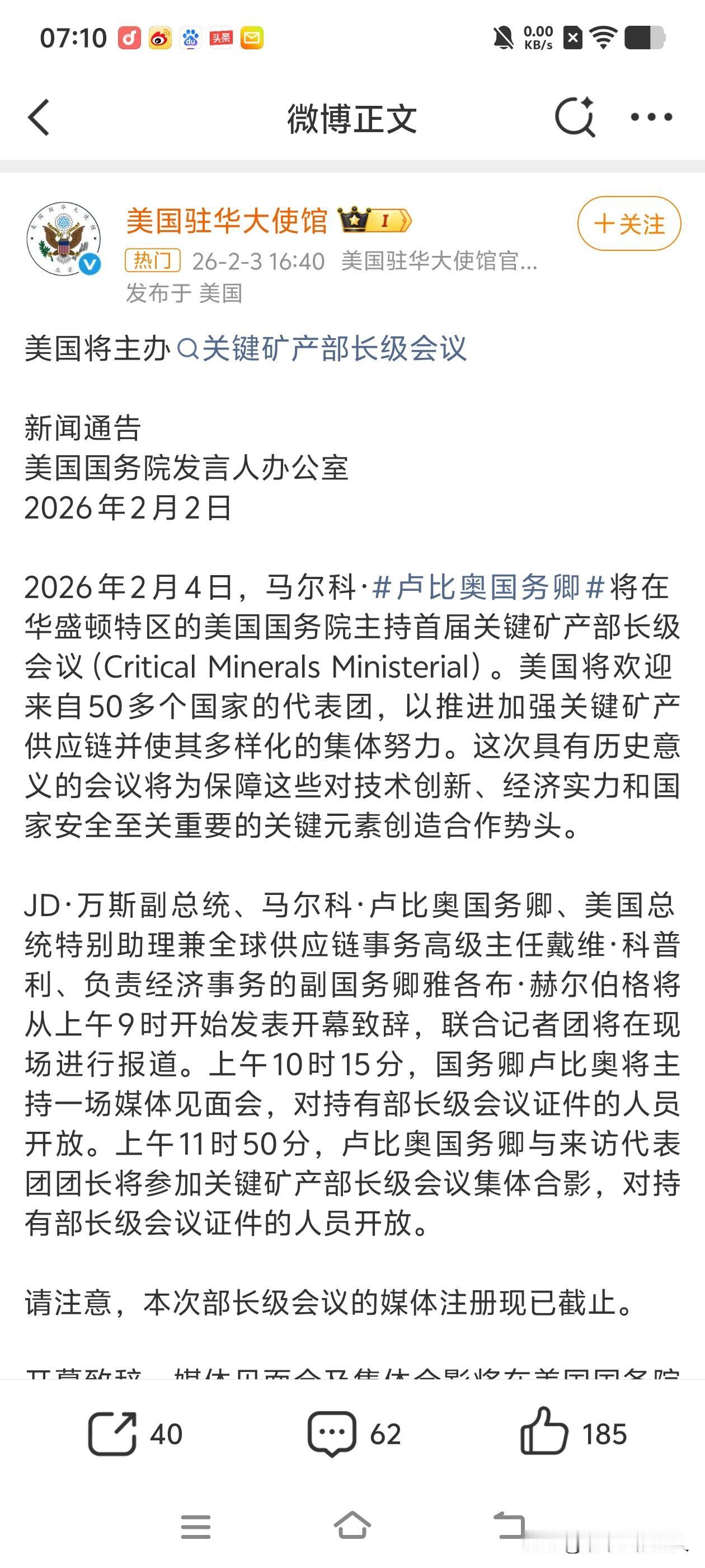 擦!不必大惊小怪! 鲁比奥召集了55个国家部长开战略矿长会议。我看去的那些国家都是小国家,没啥大用处,都是去凑热闹的,你看就拍了个照片,说了两句话就结束了。 再说了,那些国家要技术又没技术,要人才没人才,怎么能把稀土开采出来呀?等装备研制出来了,鲁比奥这一届早就干完了。就像美国商务部长所说的那样,美国被卡脖子,既然被卡脖子了,战斗机都没有稀土材料用了,脖子上总难受一点嘛,所以说,想办法解除脖子上的绳索也是可以理解的,为此不必大惊小怪。
