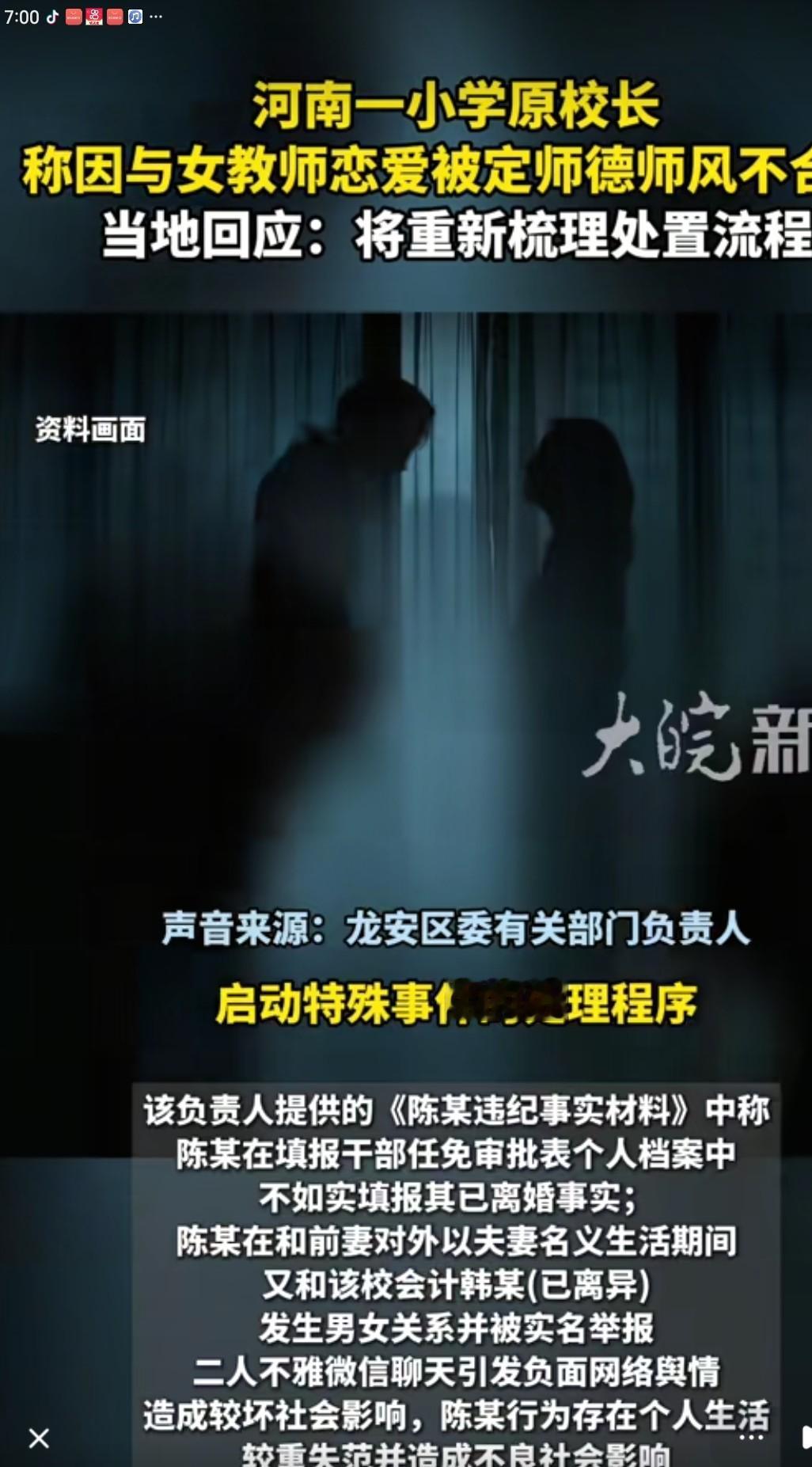 反转了!河南安阳某小学前校长在职期间与离异女教师的事儿,出现了新情况。原来他在24年5月接受审查时,被发现的问题可不止一个,而且他也签字确认了! 78年出生的陈某于2011年离婚,但在任免审批表个人档案里,没有如实写自己婚姻情况; 他虽与前妻离婚却保持同居关系,这点尚不清楚90后代课老师韩某是否知道,但韩某前夫的介入明显让几人关系更加混乱了。 韩某前夫窃取了韩某与陈某的不雅微信内容并传播,造成了一定的负面影响。 陈某小学校长当不成,转到某中学当老师,师德师风考核为“不合格”,以后晋升晋级无望。 目前当地有关部门回应,重启调查,但陈某曾在24年审查结论下面亲笔签上“属实”,大概率不好翻盘吧!