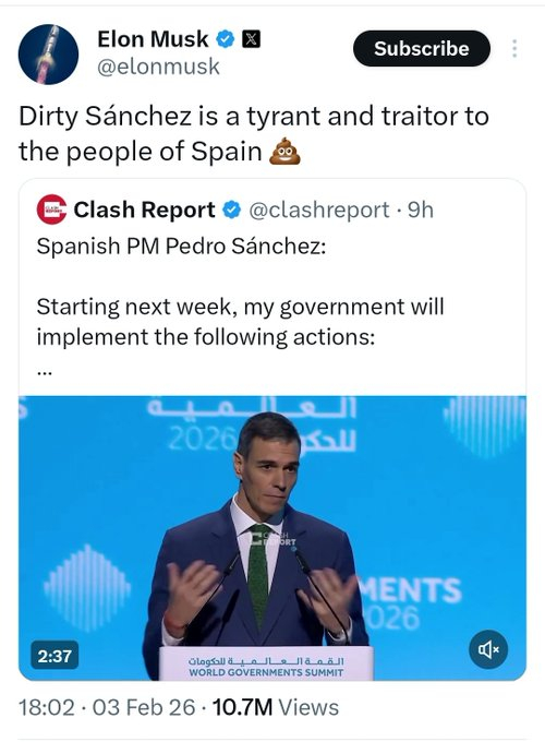 马斯克被激怒 在X平台的回复也相当“犀利与极端”称桑切斯为“Dirty Sánchez”(带有侮辱性双关语,指一种性行为 + 肮脏),并配粪便表情符号。直呼他是“暴君(tyrant)和西班牙人民的叛徒(traitor to the people of Spain)”。升级称“桑切斯才是真正的法西斯极权主义者(the true fascist totalitarian)”。