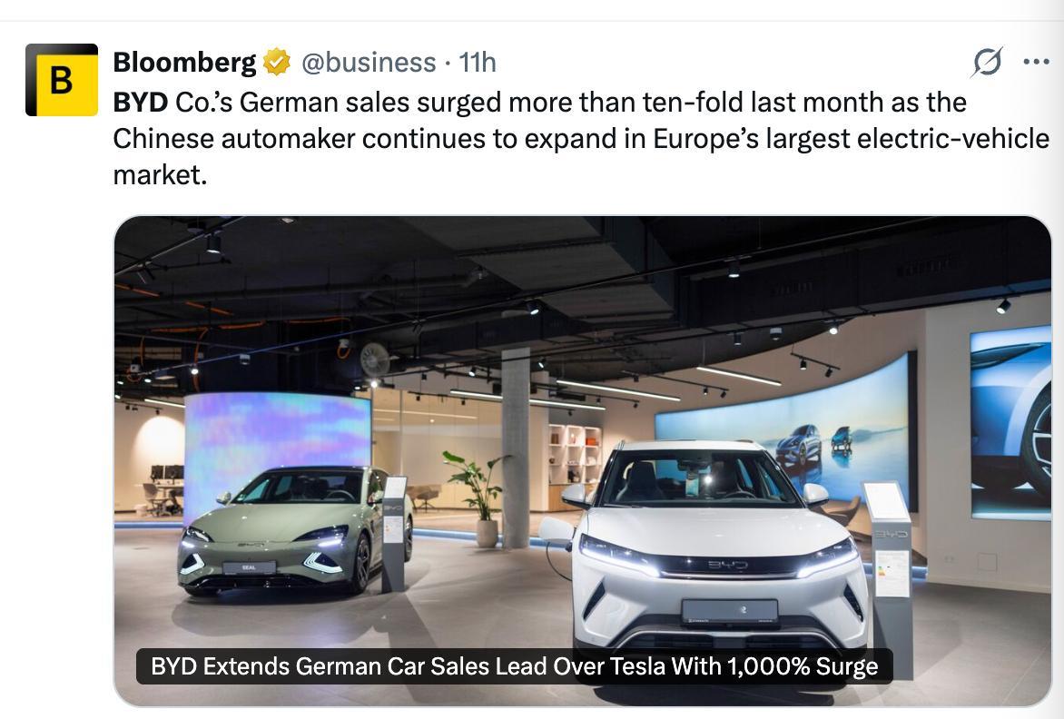 【比亚迪2026年1月份在德国销量同比暴增10倍,超特斯拉1倍】德国联邦汽车运输管理局星期三(2月4日)发布的数据显示,比亚迪1月份在德国售出2629辆新车(新车价格比国内高一倍),远高于去年同期的235辆。这一销售数据是特斯拉1301辆的两倍多。看来,2026年在德国的销量有望接近3万辆新能源出海比亚迪唐德国售价比国内高出一倍