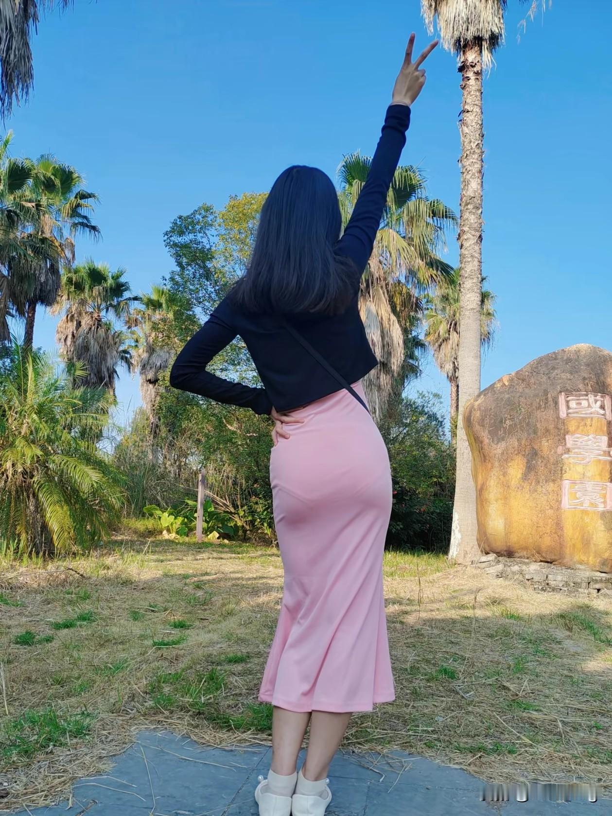 蓝天棕榈树下,背影也能美成风景🌴 黑色上衣+粉色鱼尾裙,温柔又带点小俏皮~ 比个耶,和春天 say hi! 春日穿搭 背影杀