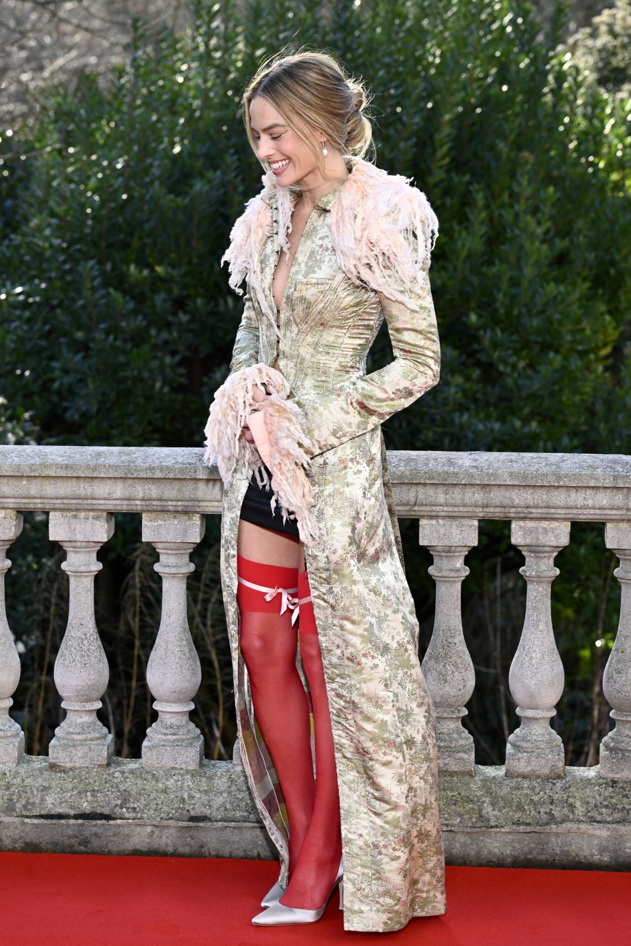 玛格特·罗比(Margot Robbie)于2026年2月4日在伦敦参加《呼啸山庄》的拍照会,身穿复古Galliano连衣裙,配珍珠和高跟鞋。