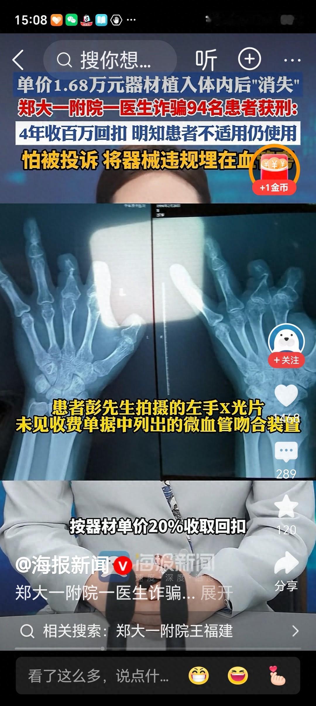 丧尽天良!手术刀竟成敲骨吸髓的敛财刀!1.68万的天价进口器材号称植入体内,X光片下却凭空消失;三甲名医身披白大褂,干的全是虚假计费、狂捞百万回扣的龌龊勾当! 被患者联名投诉仍死性不改,竟还耍阴招将器械缝进肉里掩人耳目,郑大一附院王福建这桩恶行,直接把医疗腐败的遮羞布撕得稀碎,其心之黑、其行之恶,看得人怒血上涌、齿冷心寒! 这起横跨4年、坑害94名伤者的医疗诈骗案,从不是单个医生的道德沦丧,更是直刺医患信任的尖刀,狠狠扎在每一个普通人的心上!我们一起来看这桩触目惊心的医疗黑幕! 综合新派新闻等媒体报道,2016到2020年,郑大一附院急诊外科原副主任医师王福建,把94名患者当成敛财工具肆意诈骗! 2016年2月,他与医疗器械供应商一拍即合,敲定20%的高额回扣,4年间违规使用343个微血管吻合装置,狂收回扣105万余元。 其中94名手指受伤患者,被他强行计费128个本就不适配的吻合装置,榨取205万余元血汗钱,这笔赃款最终被法院认定为诈骗资金。 要知道,王福建本是业内知名外科专家,别人啃不动的高难度手术他能拿下,手动缝合血管比用器械更快更好,手握救人的手术刀,心里却只装着捞钱的歪心思! 他明知手指血管过细,1.68万的吻合装置完全不适用,却偏要往收费单上硬加;明知没把带不锈钢针的器械植入患者体内,却敢堂而皇之收全款;被投诉暴露后,竟还想出把器械缝在血管旁肉里的损招避嫌,毫无医者底线,满肚子都是钻营算计! 4年间,343个器械、527万余元销售额、105万回扣,再加上给儿子的50万好处费,每一笔钱都沾着患者的鲜血与伤痛,每一分利都踩着医患信任的底线! 最令人发指的,是那些受害者的遭遇!木工王海森断指后痛不欲生,花3万多被号称植入两个器材,三年后拍X光才发现全是骗局;彭先生四根断指历经12小时手术,被收10万器材费,6个吻合装置竟全被丢进垃圾桶; 更可恨的是,还有1岁、5岁的孩童,小小年纪遭遇意外受伤,竟也被王福建当成捞钱的筹码!这些患者抱着“三甲医院更靠谱”的希望求医,本是想求一线生机,没想到却遇上趁伤打劫的恶医!他们掏出的是血汗钱,最终却被王福建换成了自己的回扣! 更值得深究的,是案件背后触目惊心的监管漏洞!早在2018年,就有患者联名投诉王福建“未用器材却收费”,可医院仅仅是将他调往分院,轻描淡写的处理,让他的诈骗行为变本加厉; 2021年媒体曝光后,医院竟还打算恢复其诊疗活动,这般纵容,何其荒唐!对于,最终王福建获刑12年、罚款40万,大家说惩罚是否太轻了呢?
