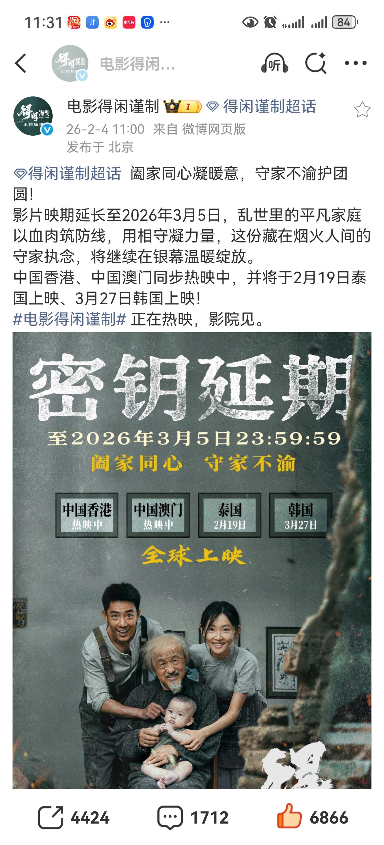《得闲谨制》密钥延期,并且已经在香港澳门上映,之后在泰国,韩国上映[赞][赞][