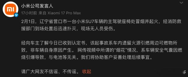 2月1日,辽宁营口市一台小米SU7车辆起火,经官方研究证明,不是车辆本身原因!并且在这次事件背后,可能潜藏着巨大的阴谋!