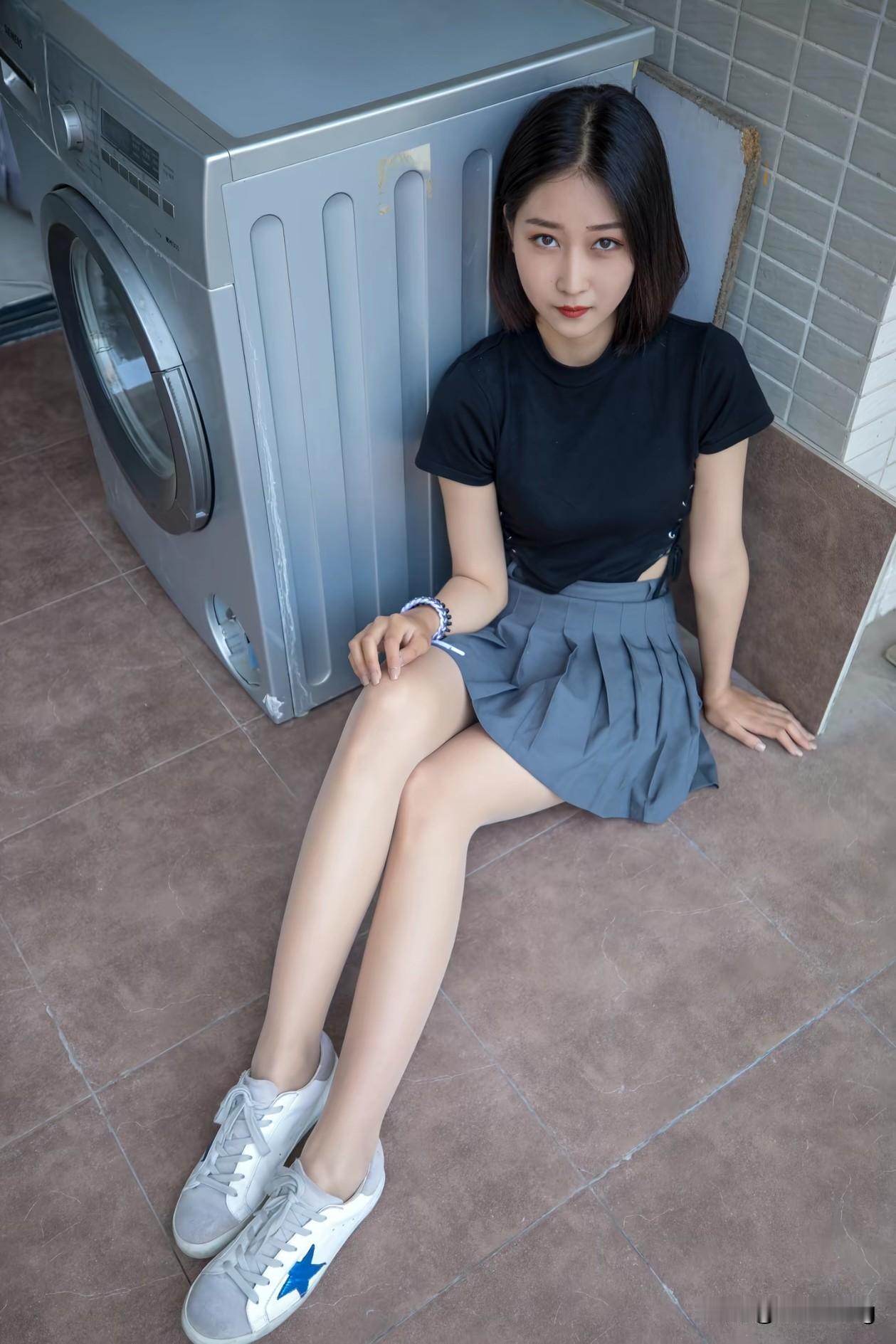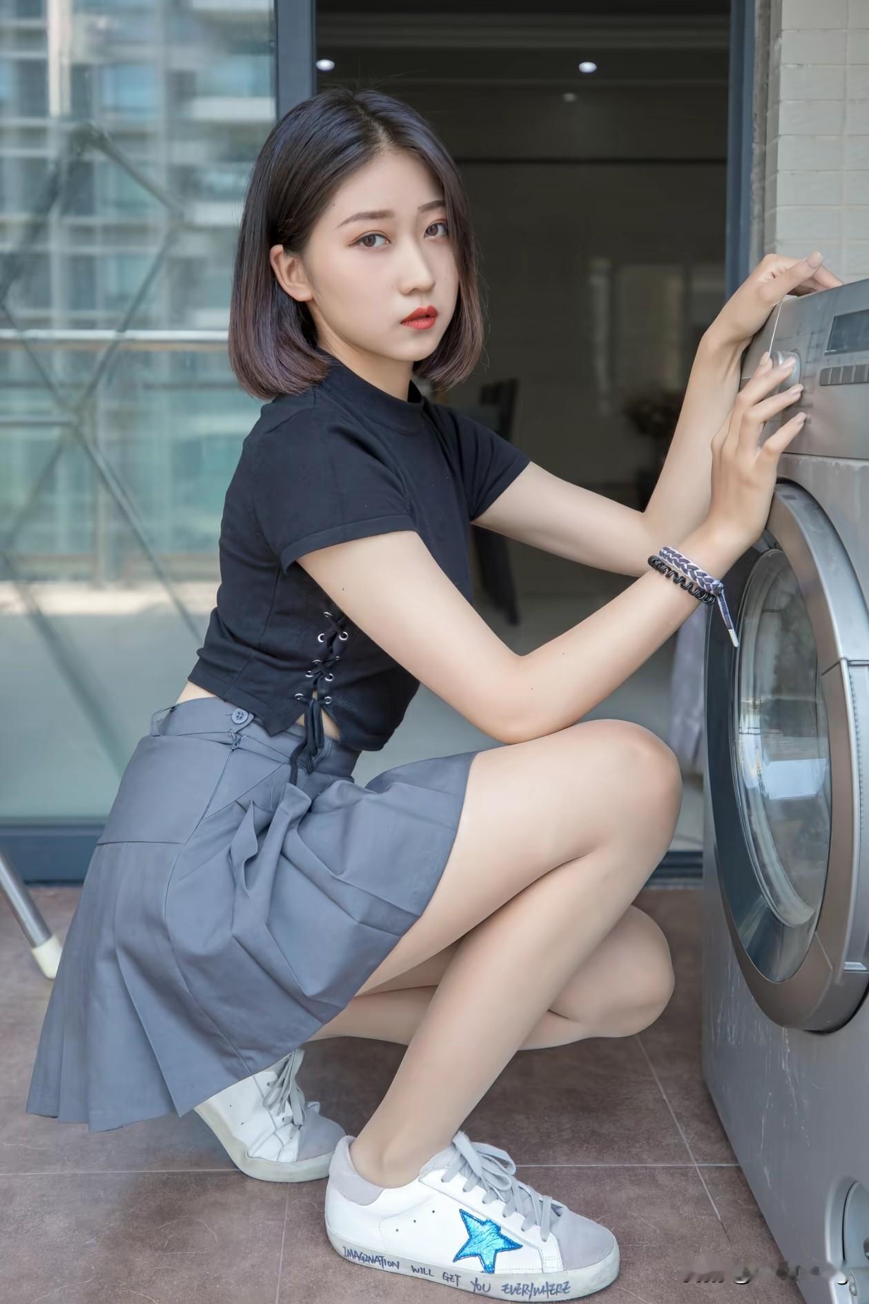 谁说家务不能时尚?蹲在洗衣机旁也能拍出大片感!🖤 简约黑T+灰色短裙,脚踩星星小白鞋,连做家务都带着高级感。生活不只有柴米油盐,还有属于自己的小确幸和仪式感~ 生活美学 居家穿搭