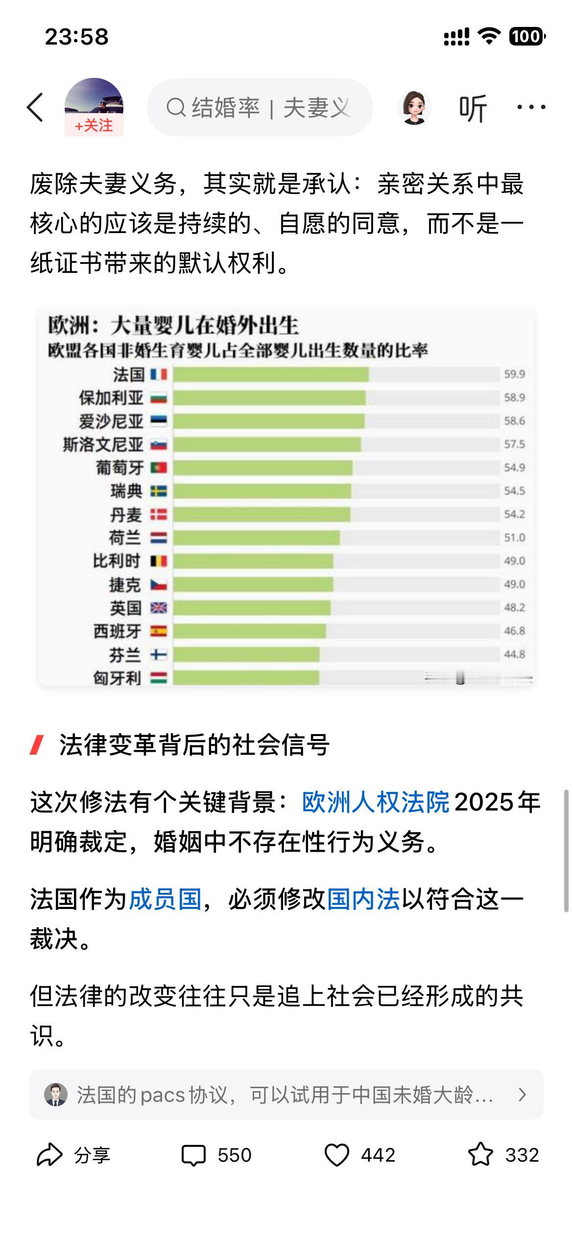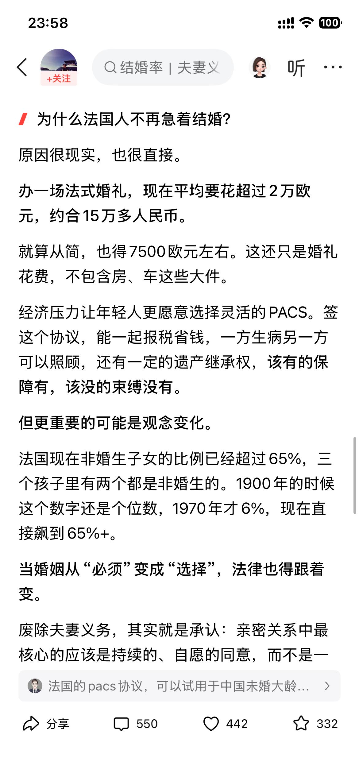 法国这种婚姻协议,范围不止于年轻人。 说实在的,这种协议更像“炮友协议”,可能确实是未来两性关系发展方向。 法国立法废除夫妻义务,即“结婚不代表性允许,不代表同床许可证。”大白话翻译:夫妻想要发生关系,也要双方同意。不同意会怎样,懂的都懂。 理是这个理,关系不能强来,长期如此,未来出轨风险不低,这是基于人性的判断。该文,也提供了生育数据,证明立法根据,问题在于:法移民生育占比多少,没说清楚,非婚生子是出轨所生,还是因没办结婚证,统计成“非婚生子”? 数据不能单看表面,细节还是要罗列清楚。 如果我们也推动PACS协议,国内有多少女性会同意?作为男性,个人表示不反对,至少不用背负彩礼车房贷等,没激情了,拍拍屁股走人, 会不会被人骂“拔D无情”?