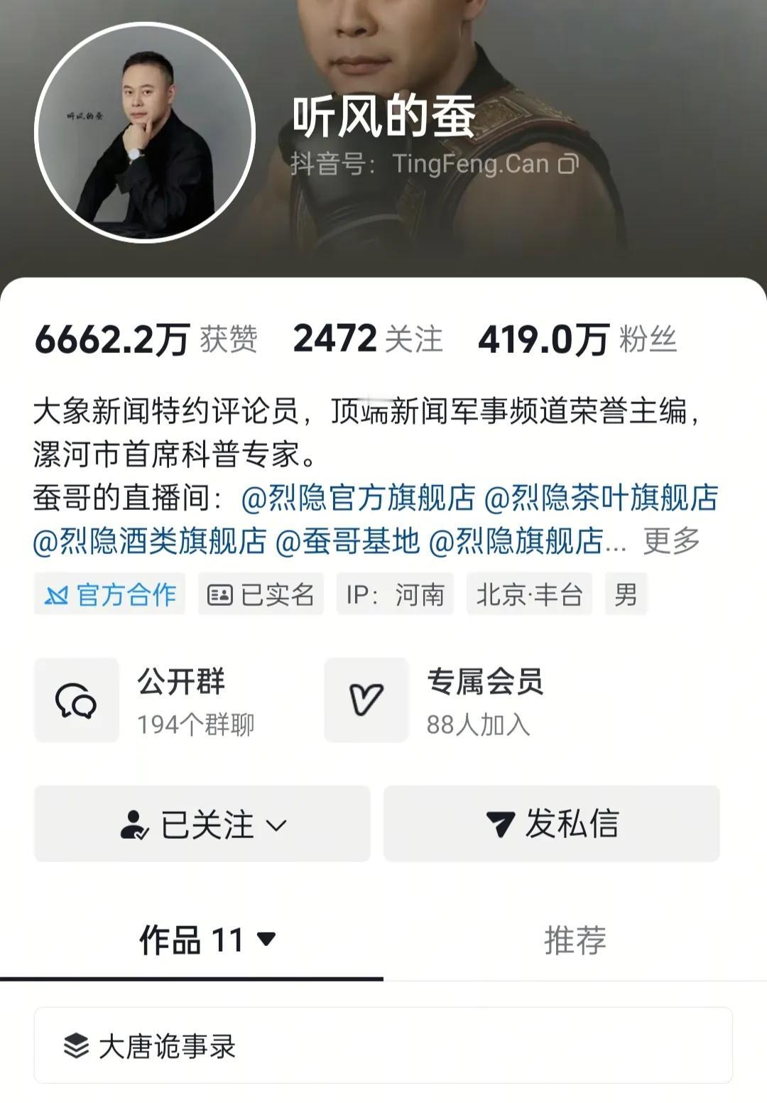 知名军事博主听风的蚕粉丝正缓慢恢复中!其众多作品已经看不到,其实大家没必要阴谋论!公开消息说违反规定规范,很多喜欢他的粉丝就不同意了,但是,你喜欢他也不能代表他就不违反规定,不要盲目追星!我也喜欢听他的节目,不代表他做什么都是对的!