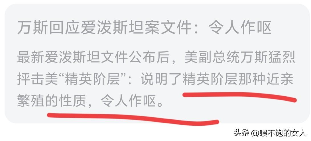 呵呵![捂脸] “令人作呕”——美国副总统万斯看了爱泼斯坦文件之后说。真是哎呀,只怪那个时候万斯太年轻了,也许那个时候万斯还是一个作家在写“乡下的悲歌”吧,可能还没入爱泼斯坦的法眼爱普斯坦! 当然了,万斯也真有可能是美国政界的一股清流啊!好好干!