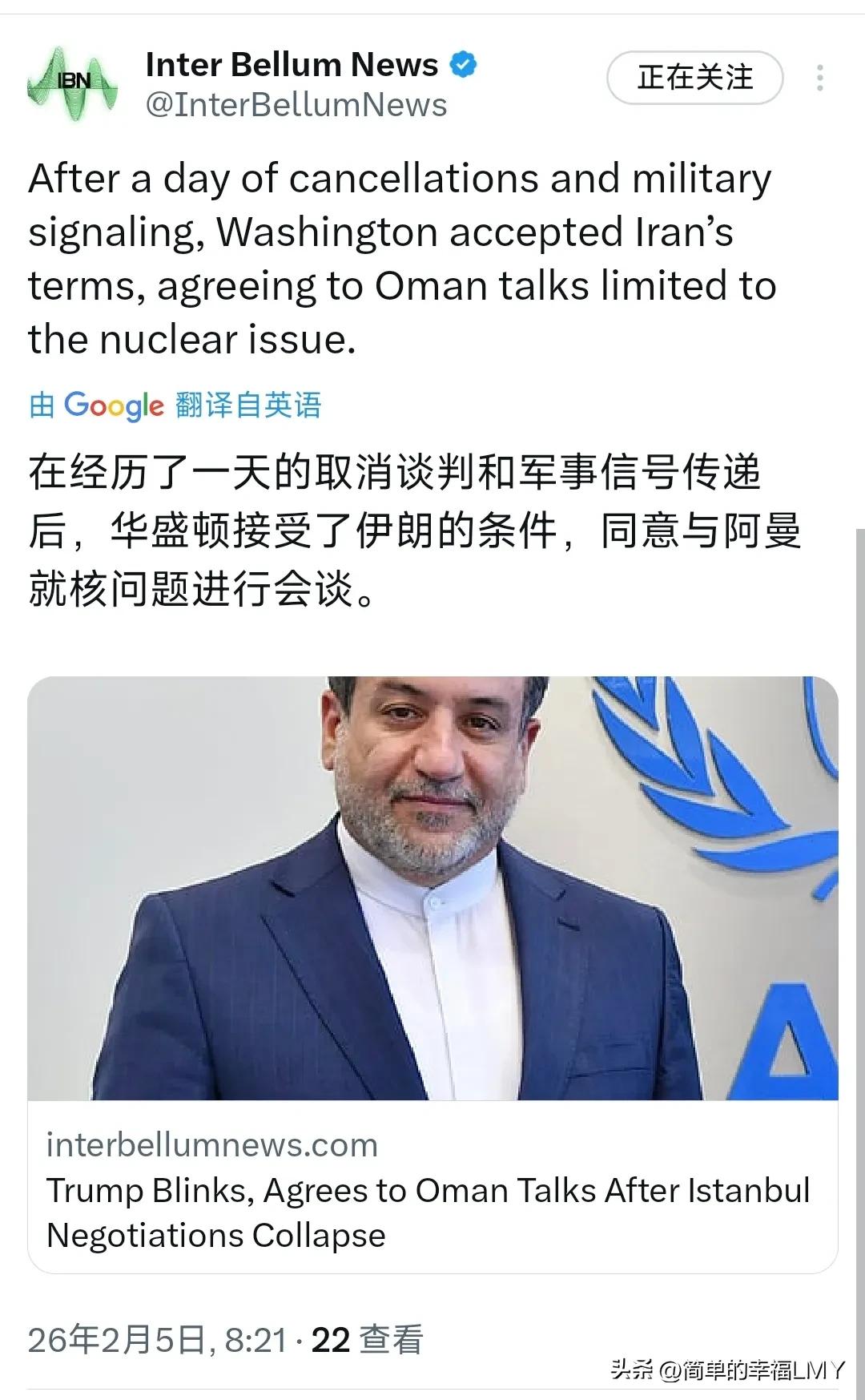 一场战争在所难免!2月5日,Axios爆出消息:美伊谈判彻底崩盘。不是谈不拢,而是根本没谈成——伊朗拒绝了美国开出的条件,美国随即撂下一句“那就什么都不做”,转身让特使史蒂夫·威特科夫收拾行李,明日就从中东打道回府。 这场本该在周五举行的会谈,还没开场就已落幕。表面看是地点之争、议题之分歧,实则是一场赤裸裸的最后通牒:你要么按我的规矩来,要么滚蛋。 美国要求把谈判地点从阿曼挪回伊斯坦布尔,还要把伊朗的导弹计划纳入议程。伊朗却坚持只谈核问题,且必须在中立国阿曼进行。双方各执一词,谁也不退半步。 可细品美方那句“我们没想到伊朗人会拒绝”,是不是透着一股居高临下的傲慢?仿佛全世界都该围着华盛顿的指挥棒转,稍有不从,就是“不识抬举”。这种心态,早已不是外交,而是胁迫。 谈判破裂之后,战争真的不可避免了吗?有人急着喊打,说伊朗唯有亮剑才能活命;有人说加沙的惨状就是前车之鉴——投降是死,不投降也是死,不如拼一把。 这话听着悲壮,却也折射出弱者的无奈。可问题是,伊朗真是弱者吗?它坐拥中东战略要地,手握导弹与区域影响力,背后还有俄罗斯这个军火库。若真被逼到墙角,难道只能束手就擒? 伊朗何与其在谈判桌上被步步紧逼,不如先筑牢自己的盾牌。买武器、练兵、强化防空系统,哪怕牺牲短期利益,也要保住长期安全。毕竟,没有枪杆子的外交,不过是纸上谈兵。 美国把导弹问题塞进谈判,用心昭然若揭。它真正害怕的,从来不是伊朗有没有核弹,而是伊朗能不能用导弹把美军基地、以色列城市乃至欧洲目标纳入打击范围。 一旦伊朗具备这种能力,美国在中东的霸权就不再牢不可破。所以,它要趁早掐断这条线。可伊朗若真答应放弃导弹,等于自断臂膀。今天交出导弹,明天就得交出主权。 历史一再证明,强权从不满足于一次让步,它只会得寸进尺。有人幻想通过妥协换取和平,殊不知在霸权逻辑里,退让只会换来更多羞辱。 当年伊拉克销毁大规模杀伤性武器,结果换来的是入侵与政权更迭;利比亚弃核,换来的是内战与国家分裂。前车之覆,后车之鉴。伊朗若天真地以为“配合就能过关”,恐怕结局比加沙还惨。 加沙至少还在抵抗,而投降的政权,连抵抗的资格都没有。 那么,伊朗该怎么办?坐等挨打?显然不行。全面开战?风险太大。但有一条中间道路:以战促和,以实力求尊严。 立即加强与俄的军事合作,采购先进防空系统、远程打击武器,甚至探讨联合演习的可能性。这不是挑衅,而是自保。你越有底气,对方越不敢轻举妄动。美国最怕的,从来不是一个愤怒的伊朗,而是一个武装到牙齿、意志坚定、盟友坚实的伊朗。 当然,战争绝非首选。但准备战争,却是避免战争的最佳方式。美国之所以敢频频施压,正是吃准了某些国家“不敢打”的心理。一旦伊朗展现出“宁为玉碎”的姿态,华盛顿反而会掂量代价。 毕竟,一场中东大战,对谁都没好处。油价飙升、全球供应链断裂、美军深陷泥潭……这些都不是拜登政府愿意看到的。所以,伊朗此刻最需要的,不是慌乱投降,也不是盲目冲锋,而是冷静布局。 一边加速军事现代化,一边争取外交支持,同时向国内民众传递清晰信号:我们不愿战,但绝不惧战。这种姿态,既是对内凝聚民心,也是对外释放威慑。真正的和平,从来不是乞求来的,而是用实力捍卫来的。 反观美国,嘴上说着“仍愿谈判”,行动却充满威胁。它一边撤走特使,一边在波斯湾增派军舰,这哪是诚意?分明是“边打边谈”的老套路。可这套把戏玩多了,别人也会免疫。伊朗若继续被动应对,只会被牵着鼻子走。 不如主动出牌,试射新型导弹、深化与真主党合作。用行动告诉世界:我们的底线不容试探。有人说,这样会激化矛盾。可矛盾早已存在,只是被暂时掩盖。美国的目标从来不是“管控分歧”,而是“改变政权”。 只要伊朗不变成亲美附庸,制裁与围堵就不会停止。既然如此,何必委屈求全?不如挺直腰杆,把命运攥在自己手里。正如一句中东谚语所说:“骆驼跪下,是为了更好地站起来。” 现在的伊朗站在十字路口:是继续幻想西方的仁慈,还是觉醒于现实的残酷?答案其实早已写在历史里。萨达姆选择了妥协,结果身首异处;卡扎菲选择了投降,结果惨死街头。 这不是鼓吹战争,而是揭示一个冷酷真相:在强权面前,软弱换不来怜悯,唯有力量才能赢得尊重。伊朗若想活出尊严,就必须放弃“以柔克刚”的幻想,转而信奉“以刚制刚”的现实主义。武器不是万能的,但没有武器是万万不能的。 今日多造一枚导弹,明日就少一分屈辱。因为真正的和平,永远属于敢于捍卫自己的人。